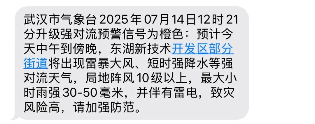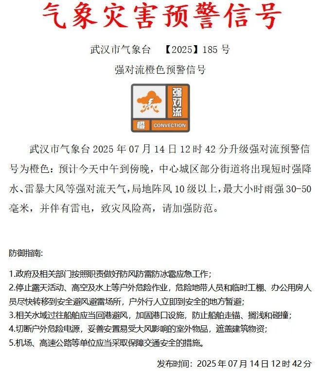 武汉市气象台2025年07月14日12时21分发布强对流橙色预警信号:预计今天中午到傍晚,我市部分街道(乡镇)将出现雷暴大风、短时强降水等强对流天气,局地阵风10级以上,最大小时雨强30—50毫米,并伴有雷电,致灾风险较高,请注意防范。