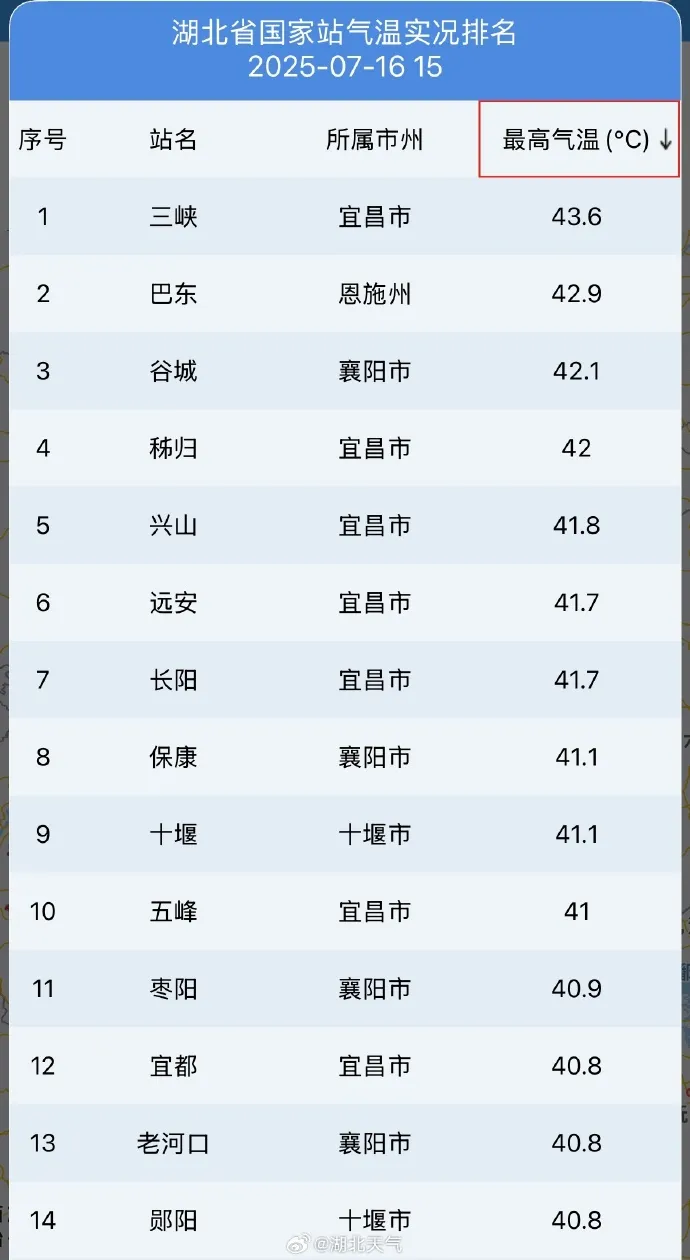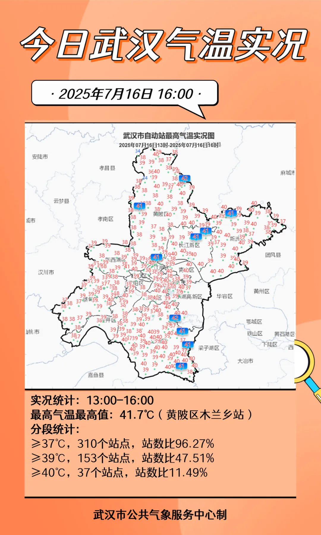 根据武汉全市自动站气温统计显示16时全市气温最高值达41.7℃99.37%站点超过35℃96.27%站点超过37℃47.51%站点超过39℃37个站点超过40℃