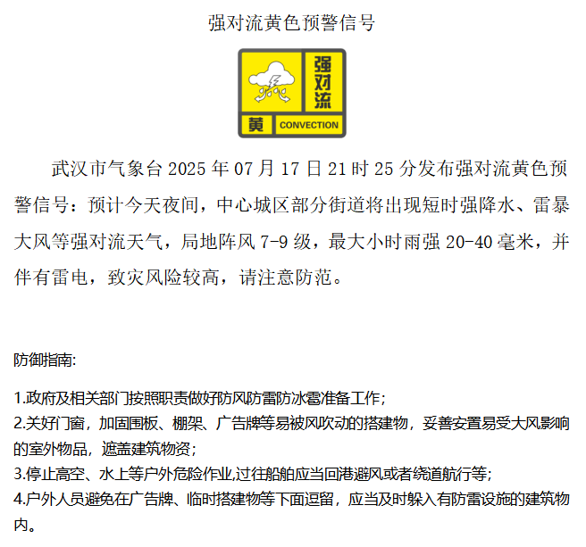 黄色预警!预计今天夜间中心城区部分街道有强对流天气