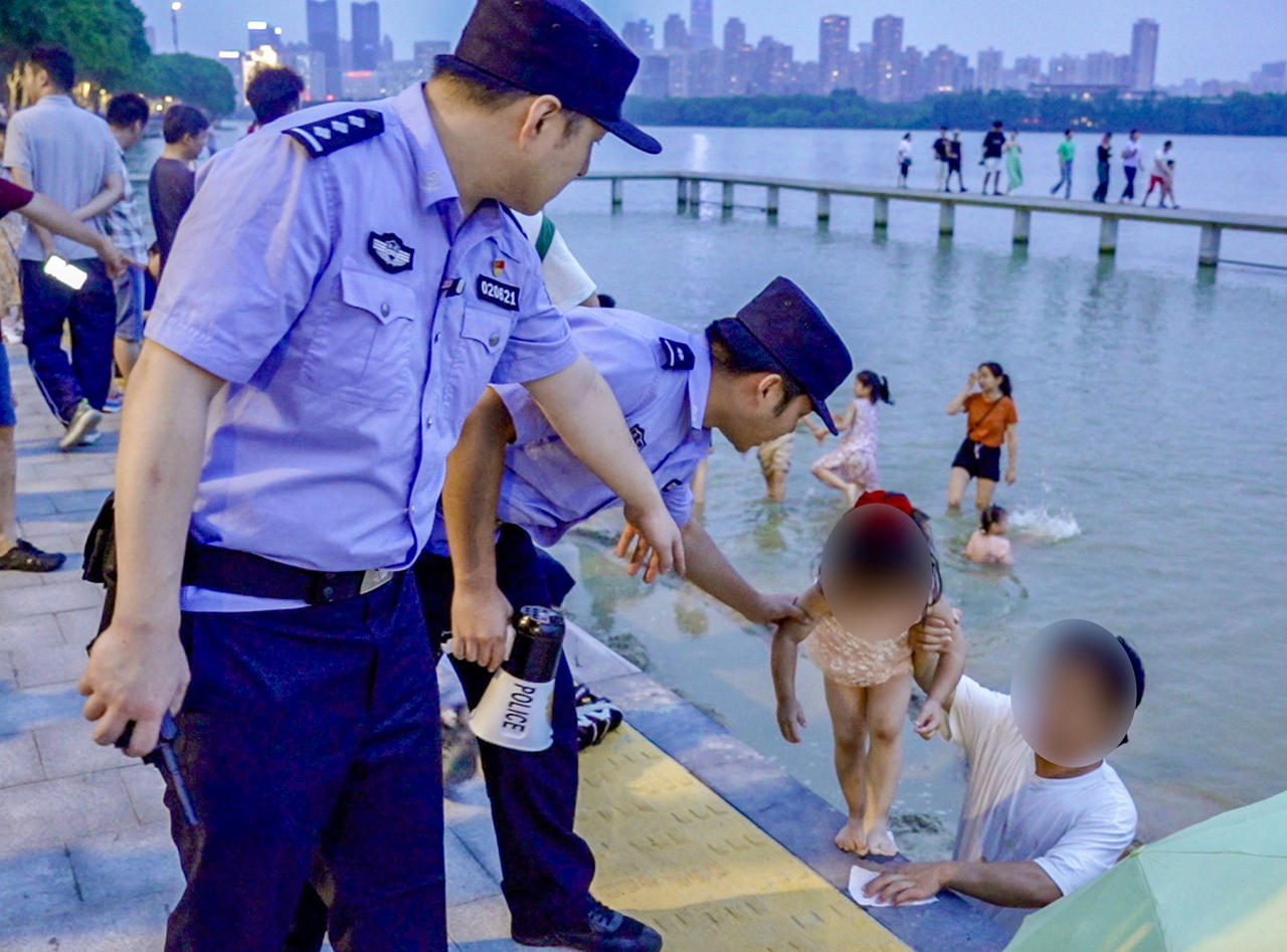 沿岸20个红色应急救援箱如同生命驿站,内置救生衣、救生圈和救生绳,扫码即取。科技装备之外,是血肉之躯的坚定守护。为将应急响应时间缩至最短,分局联合东湖绿道公司、医院及义警力量,建立起“1+N”应急响应模式,形成关键的快速救援圈。在日出日落的人流高峰时段,更多安保力量投入巡逻劝导,每日劝阻危险行为超200起。7月7日18时许,游客王先生因体力不支,被暗流卷入深水区,东湖义警谢岚椒与其他两名队员毫不犹豫跃入水中,凭借密切配合将其安全营救。三人分工协作,在暗流中合力将王先生托出水面,缓缓拽至岸边,成功化解了这场危机。