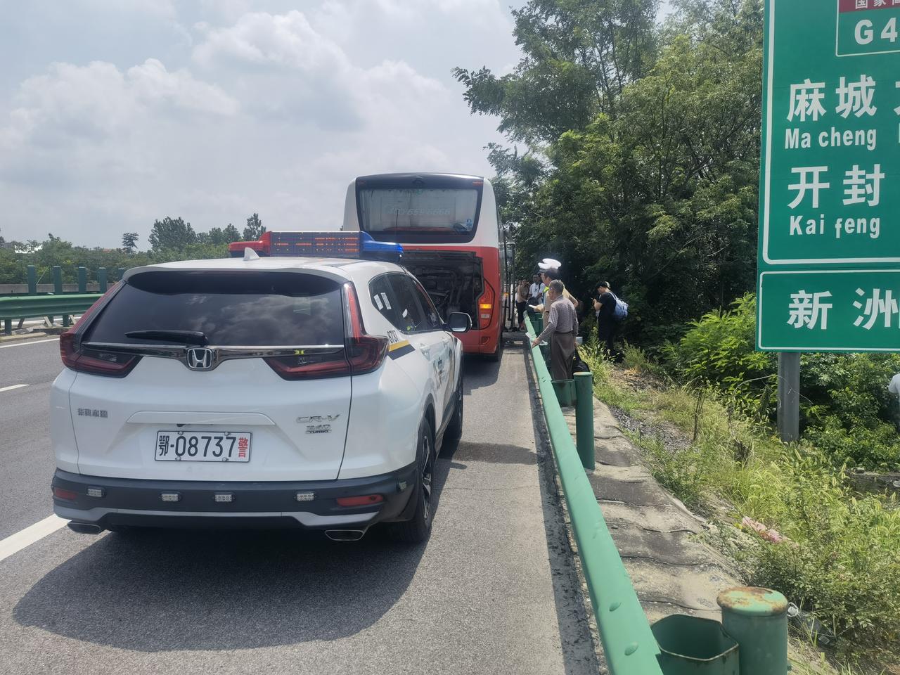 7月15日11时,沪武高速武汉段路面温度突破50℃。湖北省公安厅交管总队高速公路警察一支队江岸大队民警黄葛亮等人巡逻至沪武高速武汉方向706公里处,发现对向车道一辆大型客车异常停靠,多名乘客在应急车道内滞留,该车也未开启双闪灯,十分危险。