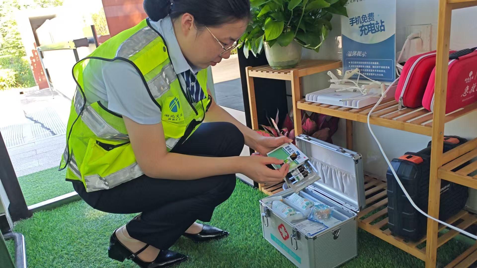 经了解,婆婆今年74岁,是周边区域的绿化维护人员,因高温天气持续户外作业引发身体不适。面对工作人员的耐心询问,老人称只需简单休息片刻便能缓解。志愿者随即递上饮用水、西瓜和防暑降温药品,并轻声安抚老人情绪,细致周到的照料,让老人在炎炎烈日中感受到了丝丝凉意。