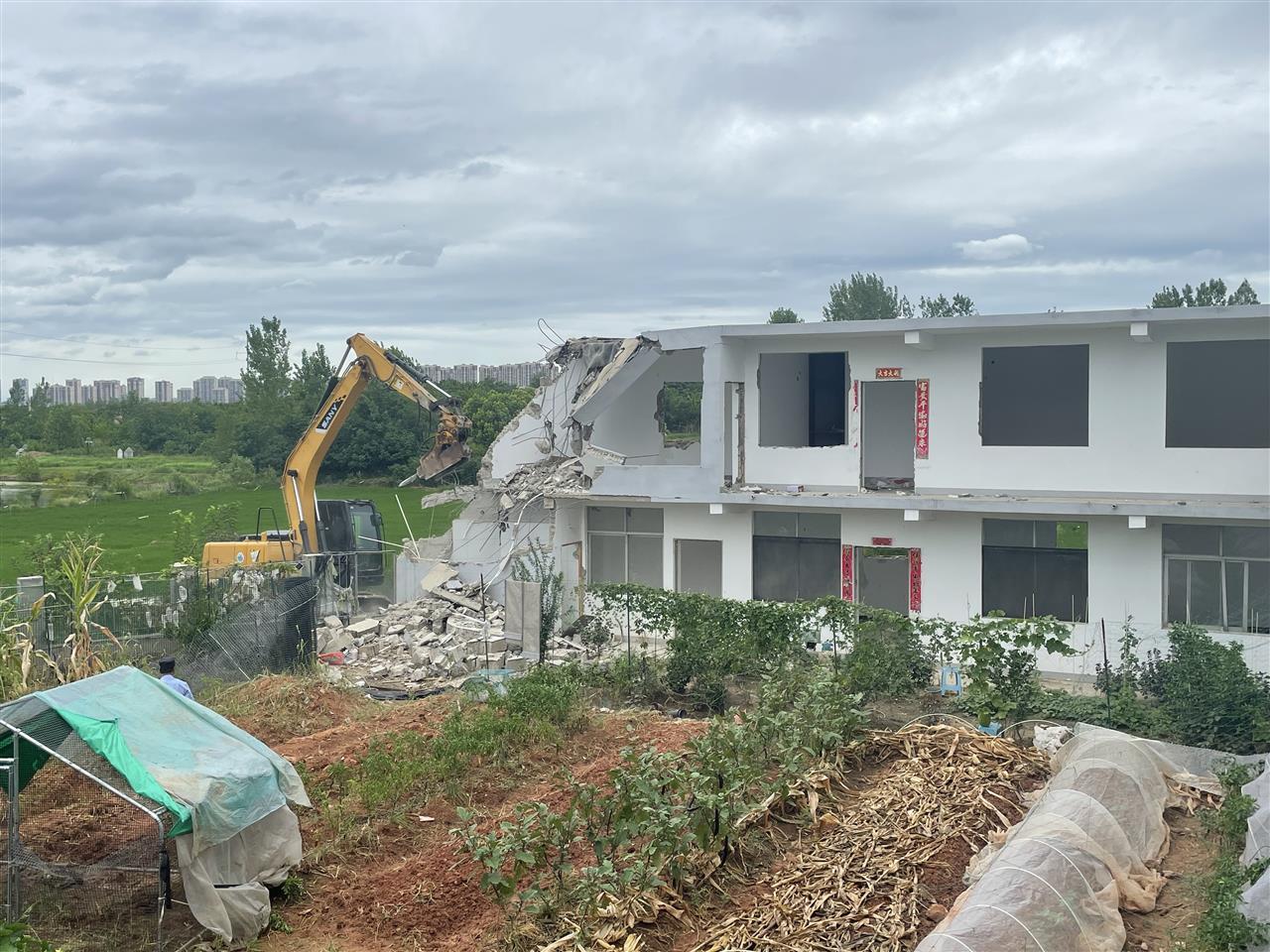 7月23日,拆违人员调来一台啄木鸟机械,将违建及时拆除,恢复耕地用途。