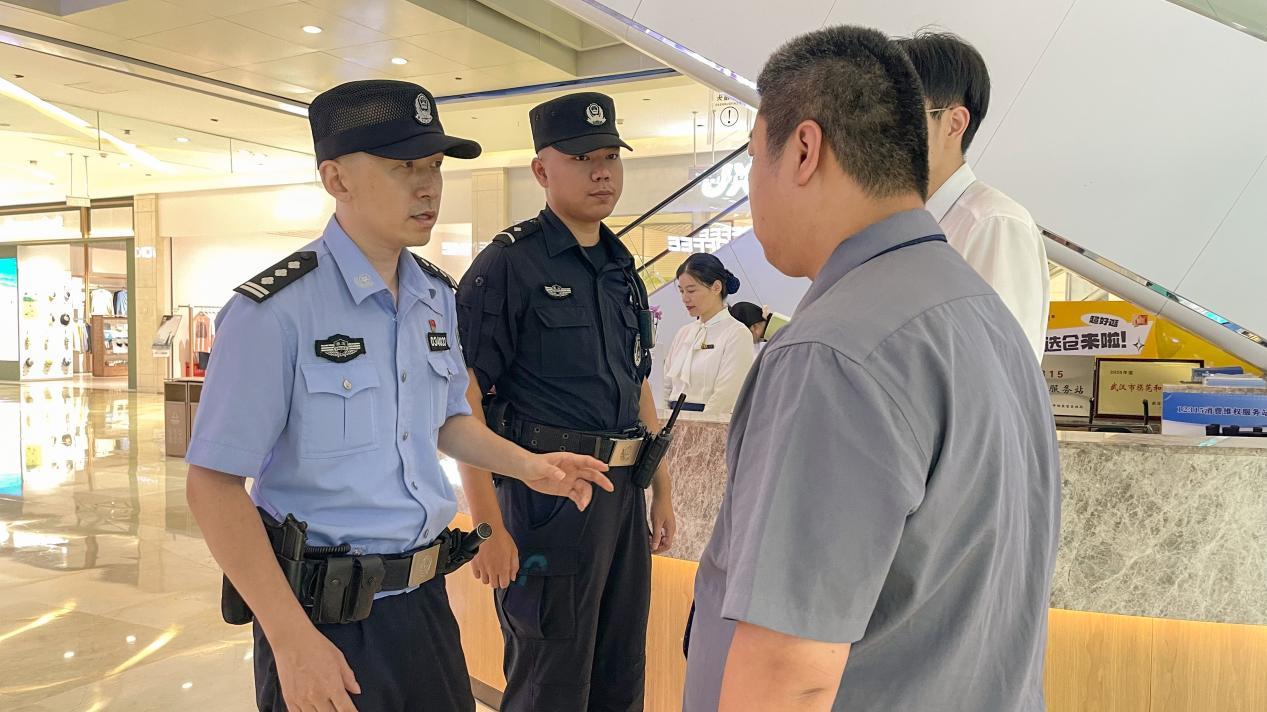 武商城市奥莱商场中庭,青山分局反巡特大队民警尹恒和队员们早已整装待发,步伐坚定地行进在巡逻之路上。