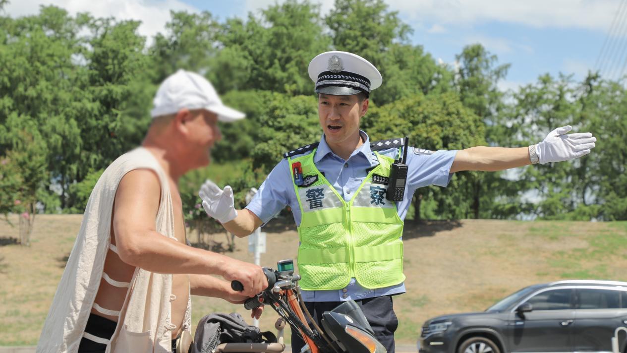 “师傅,骑行路上风景虽好,但您的平安更珍贵,下次出行要记得佩戴安全头盔啊。”上午8时30分,户外体感温度已达到40℃。发现一名骑电动自行车的爹爹没有佩戴安全头盔,左龙随即上前暖心提醒。