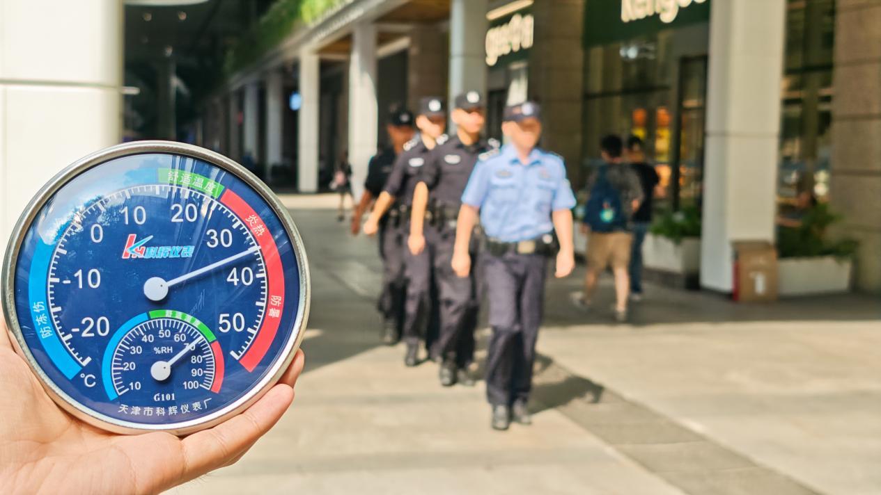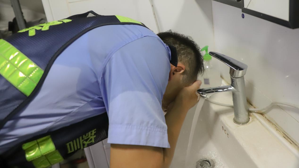 尽管天气炎热,民警辅警们的“标配”一件也不能少:对讲机、执法记录仪、伸缩警棍、辣椒喷雾……十多斤的单警装备时刻挂在腰间,衣服很快便被汗水浸湿。巡逻间隙,民警尹恒靠在车边休整,摘下警帽轻拧,汗水如雨般洒落地上。