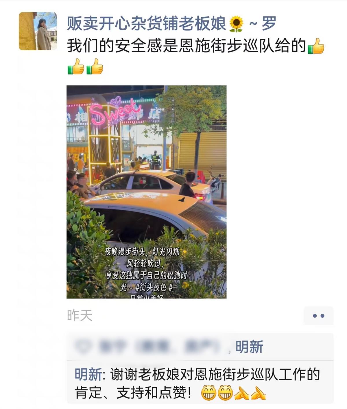 有店家掏出手机拍下民警们挺拔的背影,发到朋友圈、抖音并配文:“我们的安全感是恩施街步巡队给的”。