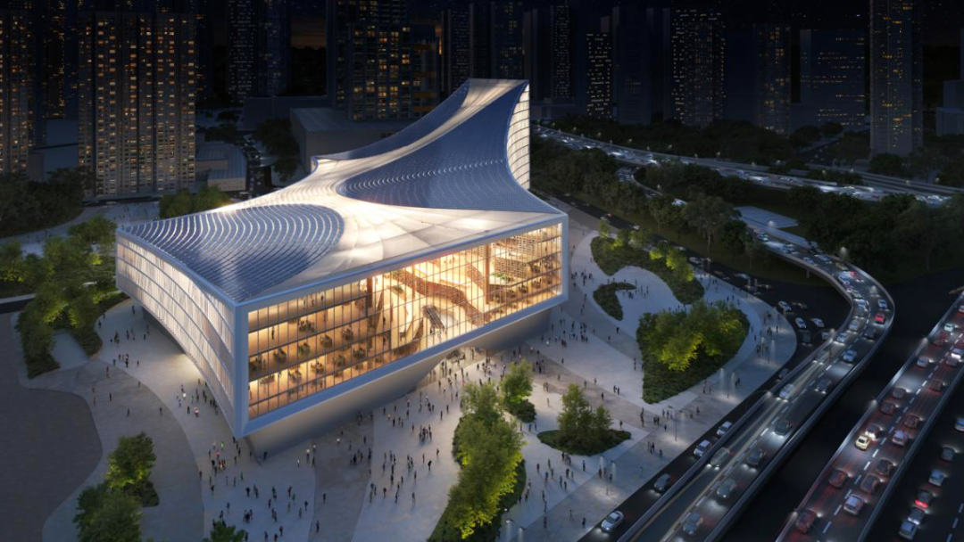武汉图书馆新馆位于武汉市江汉区王家墩中央商务区东北角,其标志性的波浪形屋顶自西南向东侧优雅跌落,从空中俯瞰,犹如一座未来感十足的“会呼吸的知识峡谷”。