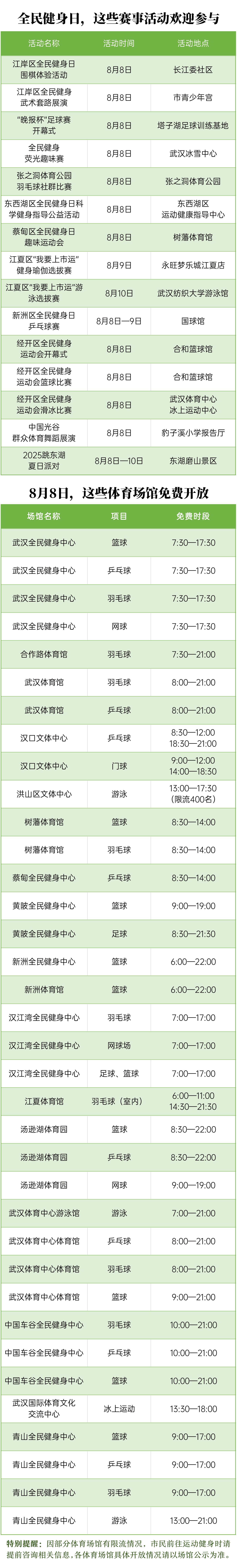 8月8日是全民健身日,武汉市、区体育部门将举办丰富多彩的全民健身赛事活动,欢迎体育爱好者参与其中。同时,市、区部分公共体育场馆将免费开放,欢迎市民前往运动健身。