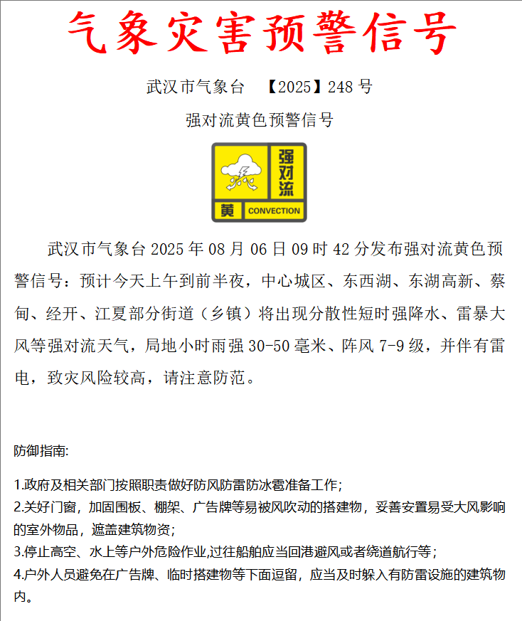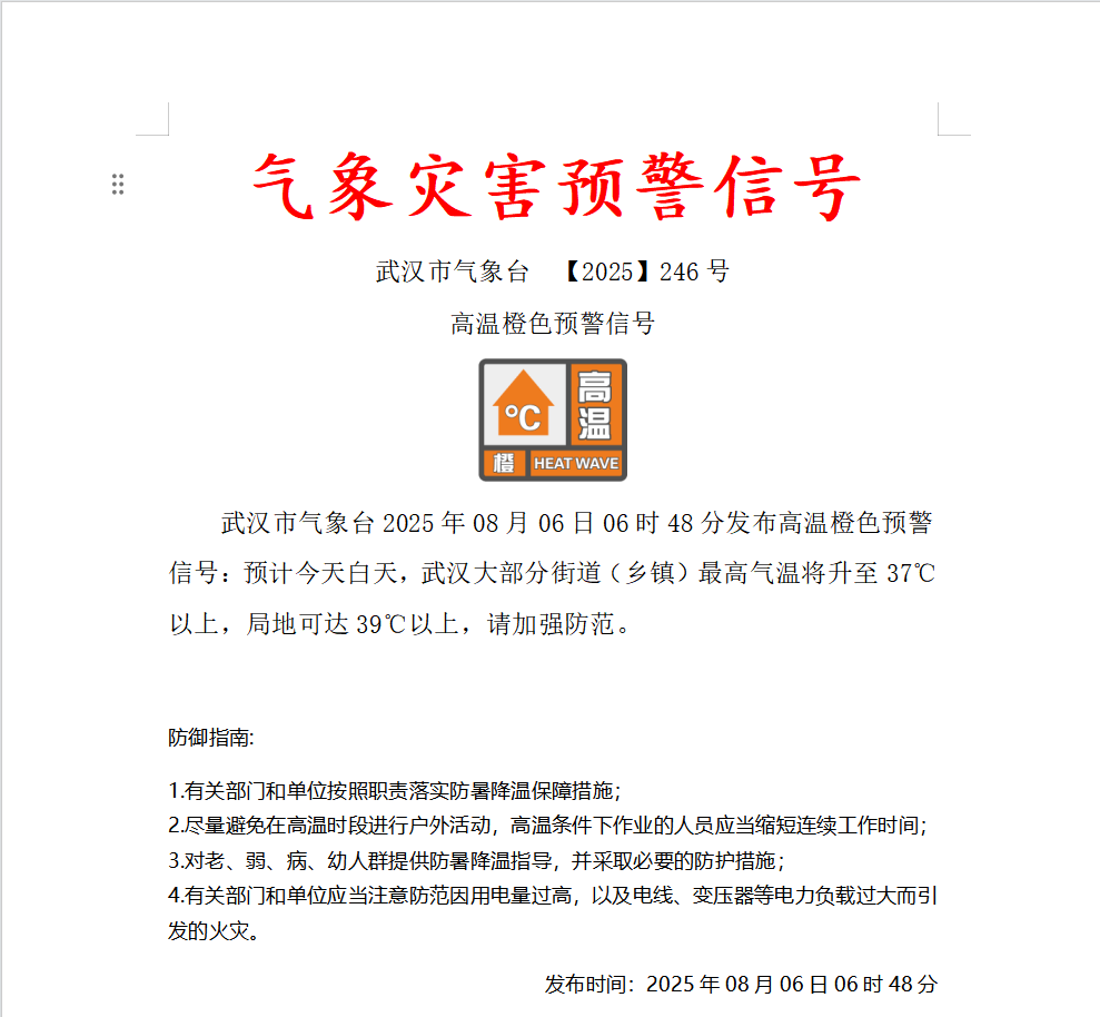 预计6-10日武汉市高温持续,多分散性阵雨或雷阵雨,大部地区最高气温38~39℃,部分地区可达40℃以上;11-13日武汉市有降水过程发生,高温缓解。