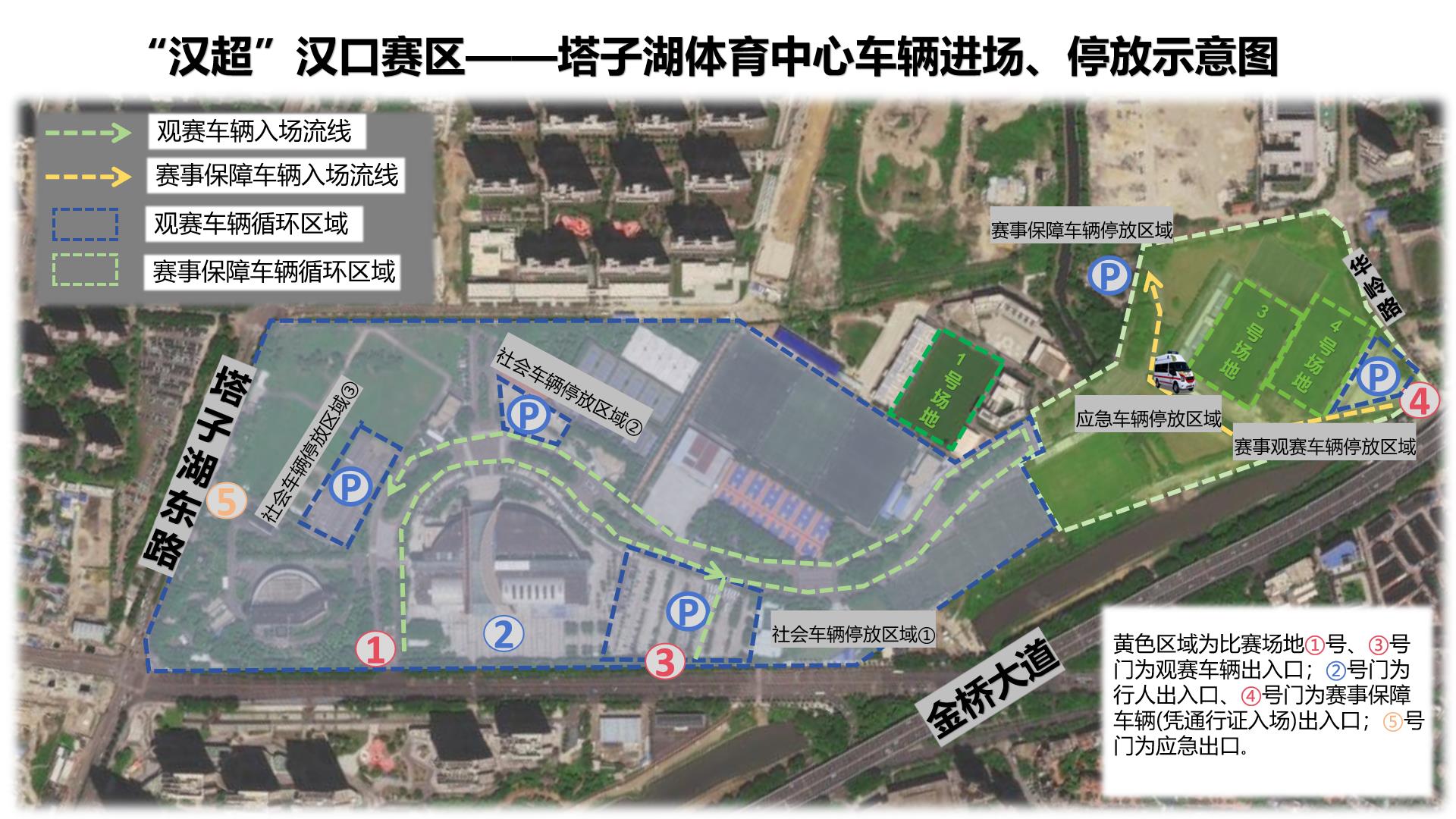由于塔子湖体育中心周边停车位有限,强烈建议观赛人员选择乘坐地铁或者公交车等绿色出行方式。
