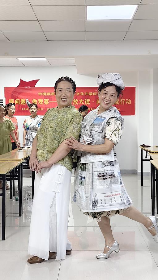 随后进入创意实践环节。在居民志愿者喻女士的带动下,40位居民化身“资源再生巧匠”,将废旧报纸制成典雅礼服、创意时装等时尚单品。居民志愿队长段女士表示:“我们计划每月开旧物改造课,带动更多邻居参与。” 同步成立的“洞洞鞋环保宣传队”,队员手绘垃圾分类主题鞋,让环保理念成为社区流动风景线。