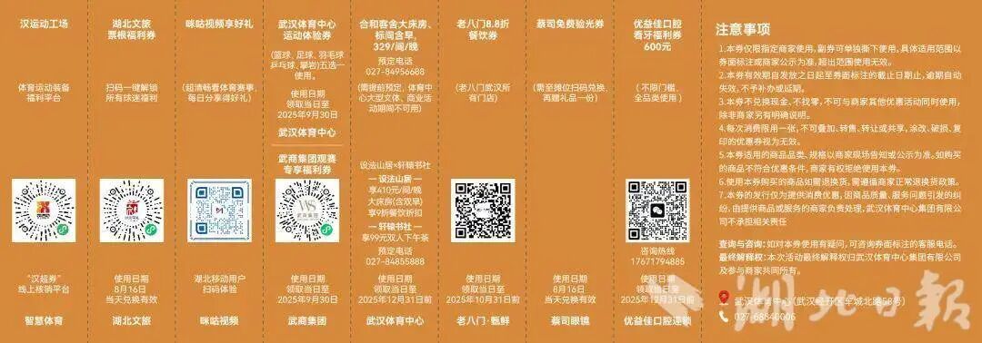 来观看开幕式的球迷朋友们检票后,会有工作人员在闸机处发放纸质版球迷福利券,上有武汉体育中心运动体验券、武商集团观赛专享福利券、湖北文旅票根福利券、蔡司免费验光券等多种优惠信息,可叠加使用于汉超美食生活荟,逛吃逛喝!
