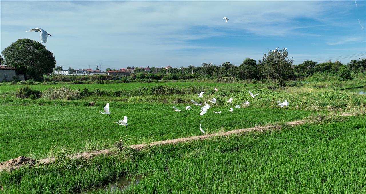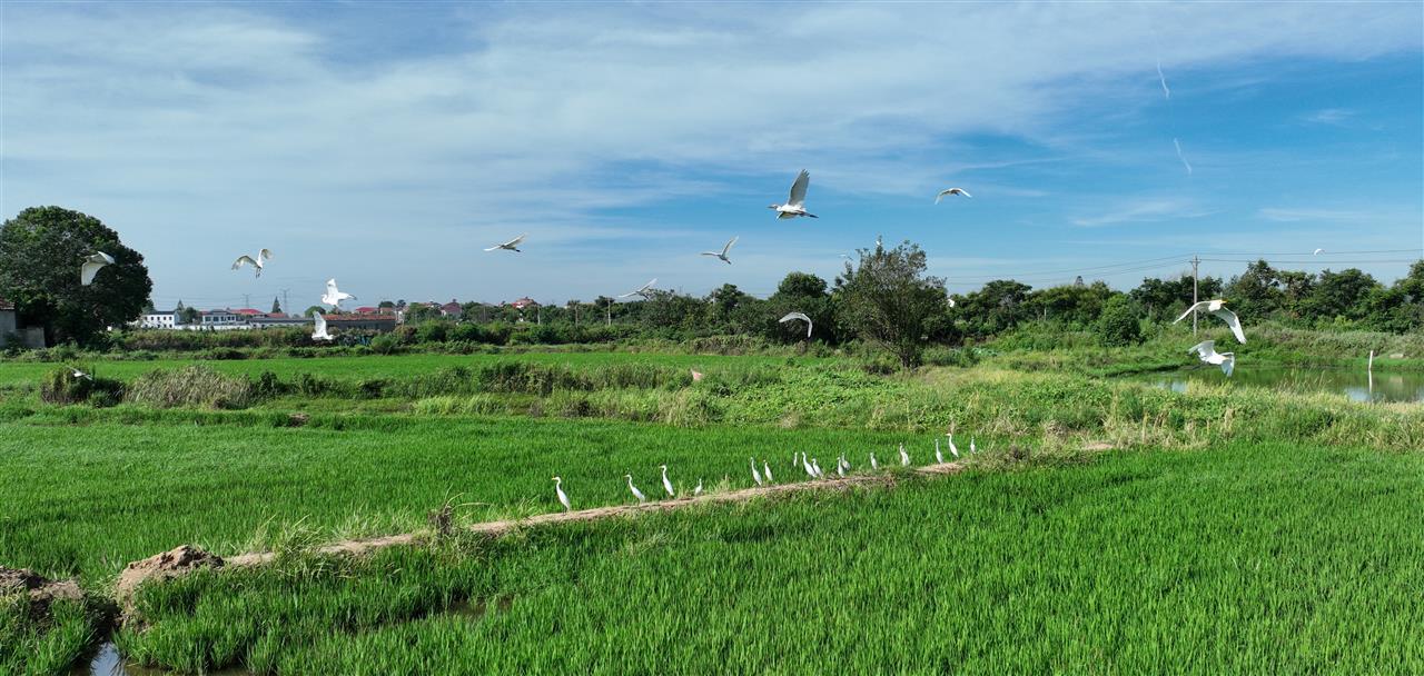 湛蓝的天空下,白云悠悠飘荡,与白鹭的身影交相辉映。翠绿的稻浪、洁白的水鸟、远处的村庄在光影里交融,勾勒出一幅动静相宜的田园图景,将自然生态的和谐之美展现得淋漓尽致。