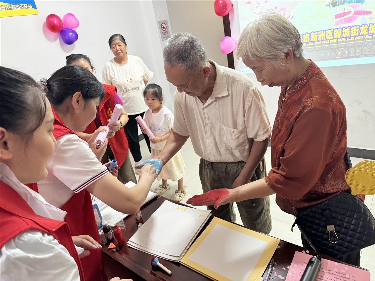 画布铺展,颜料备好,“携手印心,爱满画卷”环节中,老夫妻们挽起衣袖,蘸取红色颜料,一人扶着对方的手,共同在画布上按下手印。一个个交织的手印,宛如一朵朵盛开的“岁月之花”;旁边写下的“相伴一生”等字样,更让这幅画成了可珍藏的“爱情契约”。