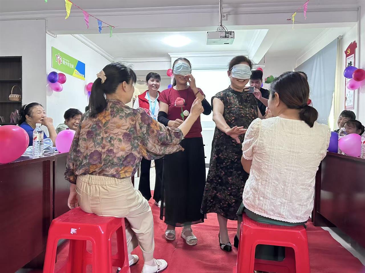 “蒙眼送花”的互动游戏则为现场增添了几分欢乐。叔叔们蒙眼后,有的凭借熟悉的气息快速找到老伴,有的在台下笑声中“走错方向”,偶尔的小失误逗得全场开怀,老人们的笑容里满是孩童般的纯粹。