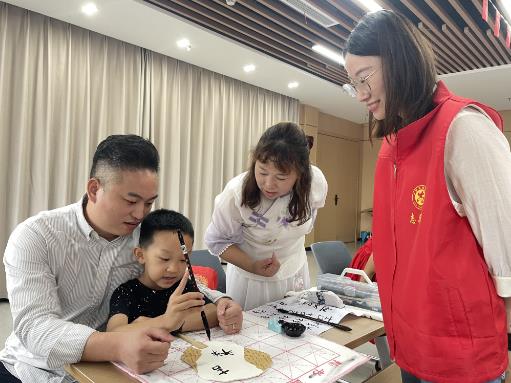 随后的创作环节成为活动的“高光时刻”。孩子们手持折扇、团扇,蘸取墨汁,一笔一划认真书写,孩子们写下了“幸福”“平安喜乐”“吉祥”等寓意美好的词语,笔锋稚嫩却透着专注。现场墨香阵阵,家长们纷纷用手机记录下孩子专注创作的瞬间,不时轻声鼓励,温馨氛围感染着在场的每一个人。