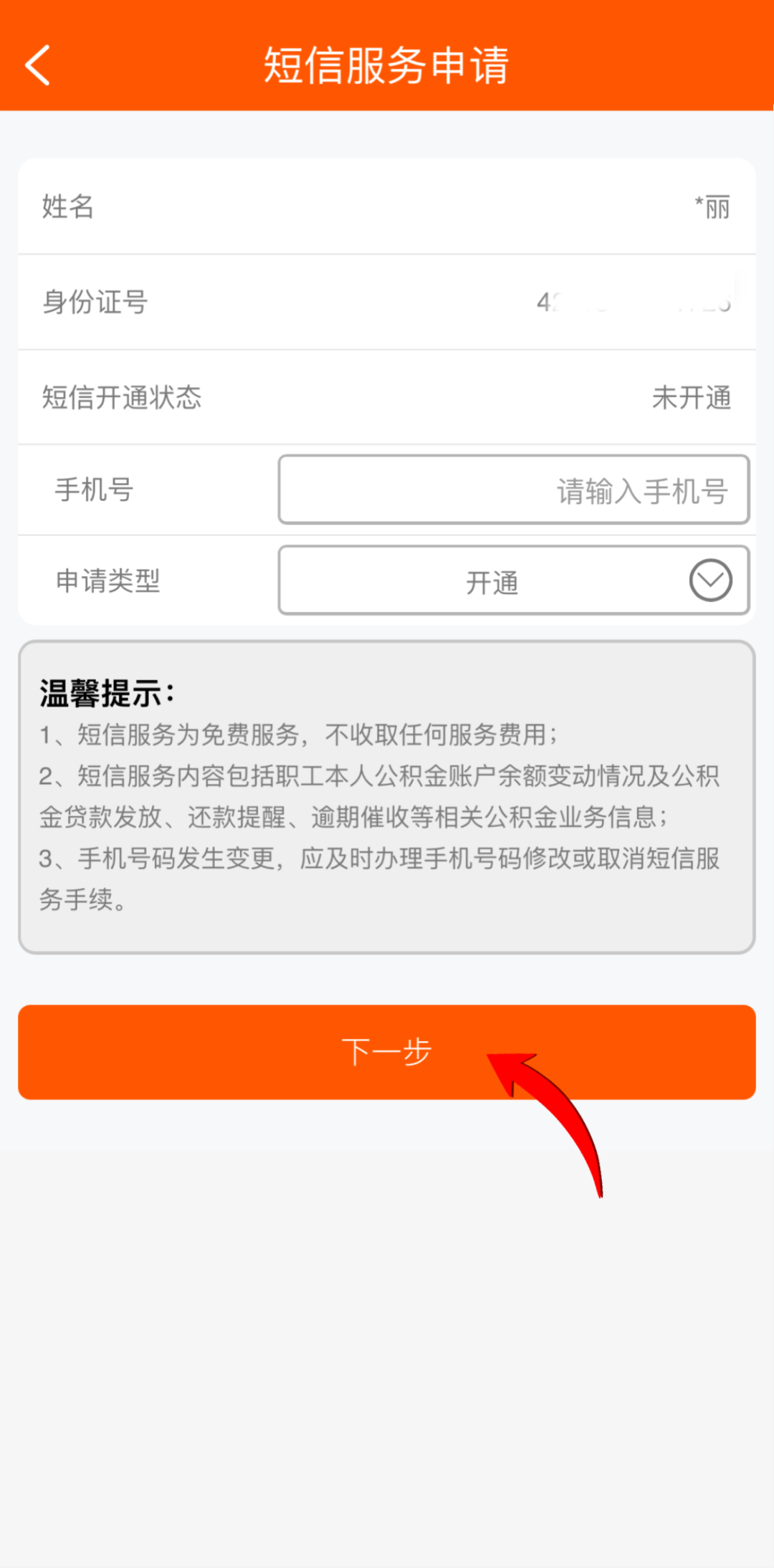 点击“我的-短信服务申请”,进入短信服务申请界面,确认个人信息是否正确,且短信开通状态为“未开通”,输入手机号,选择申请类型“开通”,点击“下一步”;