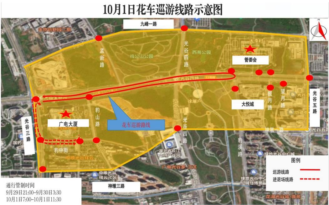 三、9月29日21:30至9月30日3:30,10月1日7:30-11:30,高新大道(光谷三路至光谷五路)禁止车辆通行。