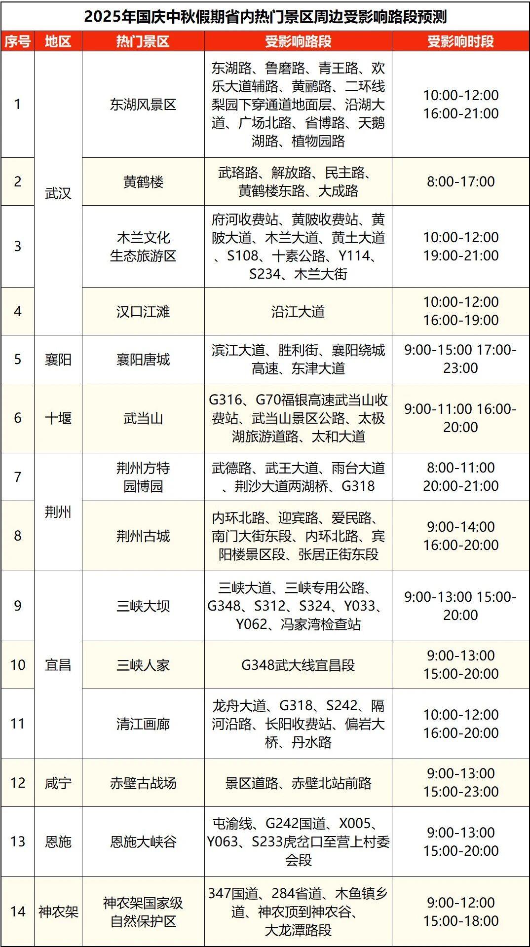 G348国道宜昌段,G242国道、G350国道、G209国道恩施段,G316国道孝感段;S233省道、S339省道恩施段,S108省道武汉段等国省道路段拥堵风险高。