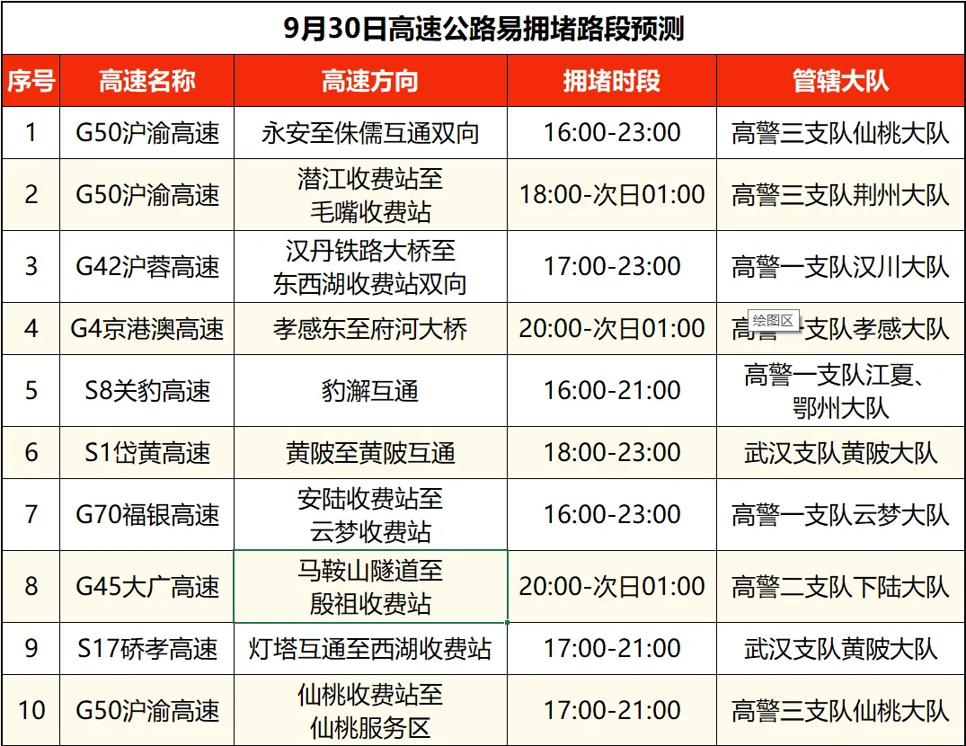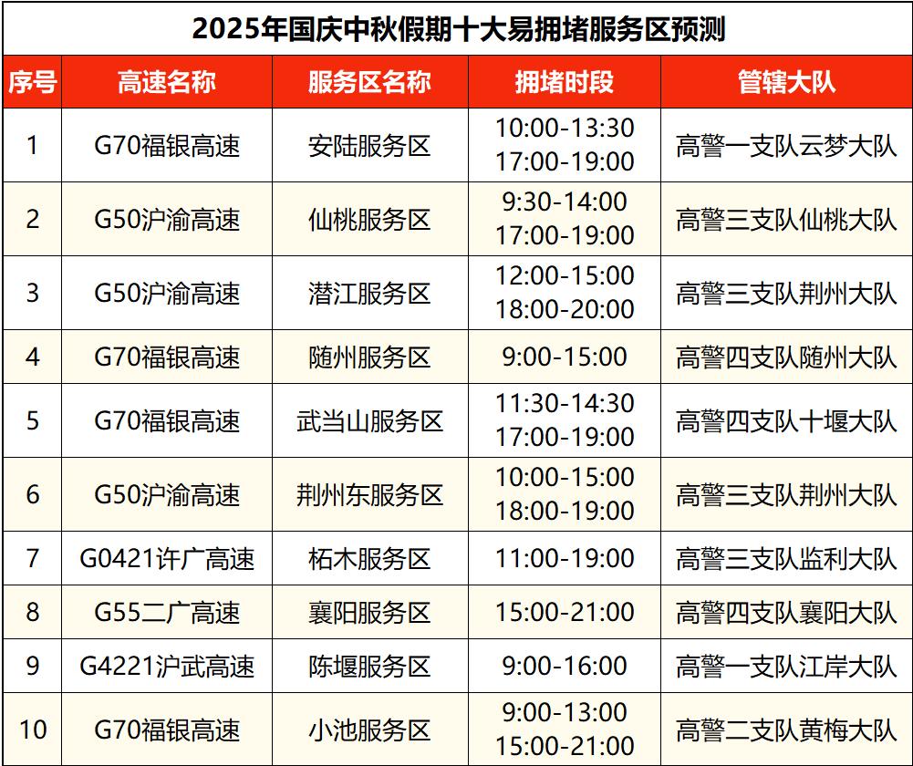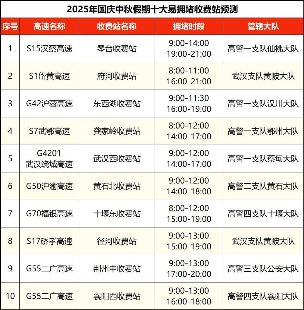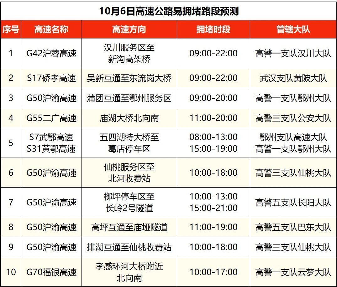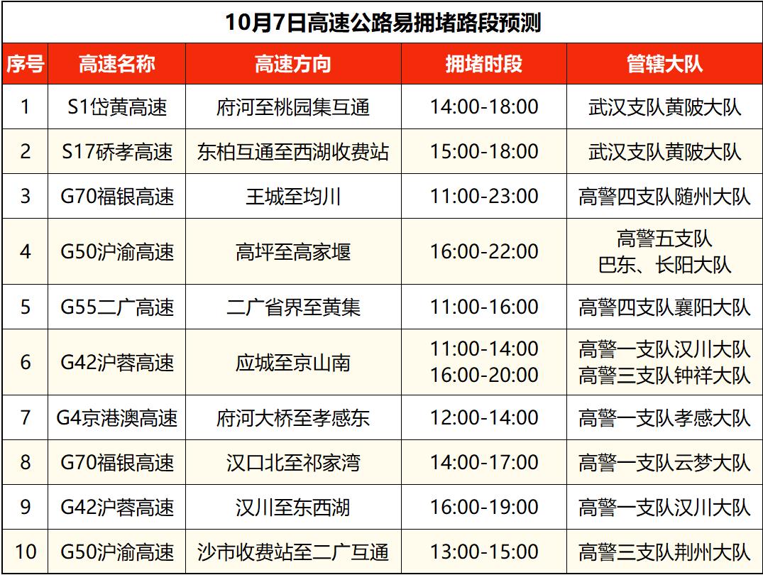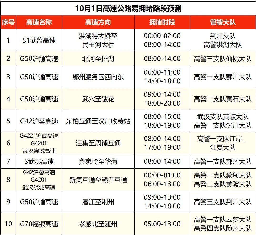沪蓉高速汉川、当阳、钟祥、黄陂段,沪渝高速仙桃、荆州、长阳、黄石、巴东、鄂州、恩施段,福银高速云梦、随州、十堰段,京港澳高速孝感段,武鄂高速鄂州段,武汉绕城高速江夏、蔡甸段,武监高速武汉段,沪武高速江岸段,二广高速襄阳段,呼北高速十堰段等高速路段拥堵风险高。