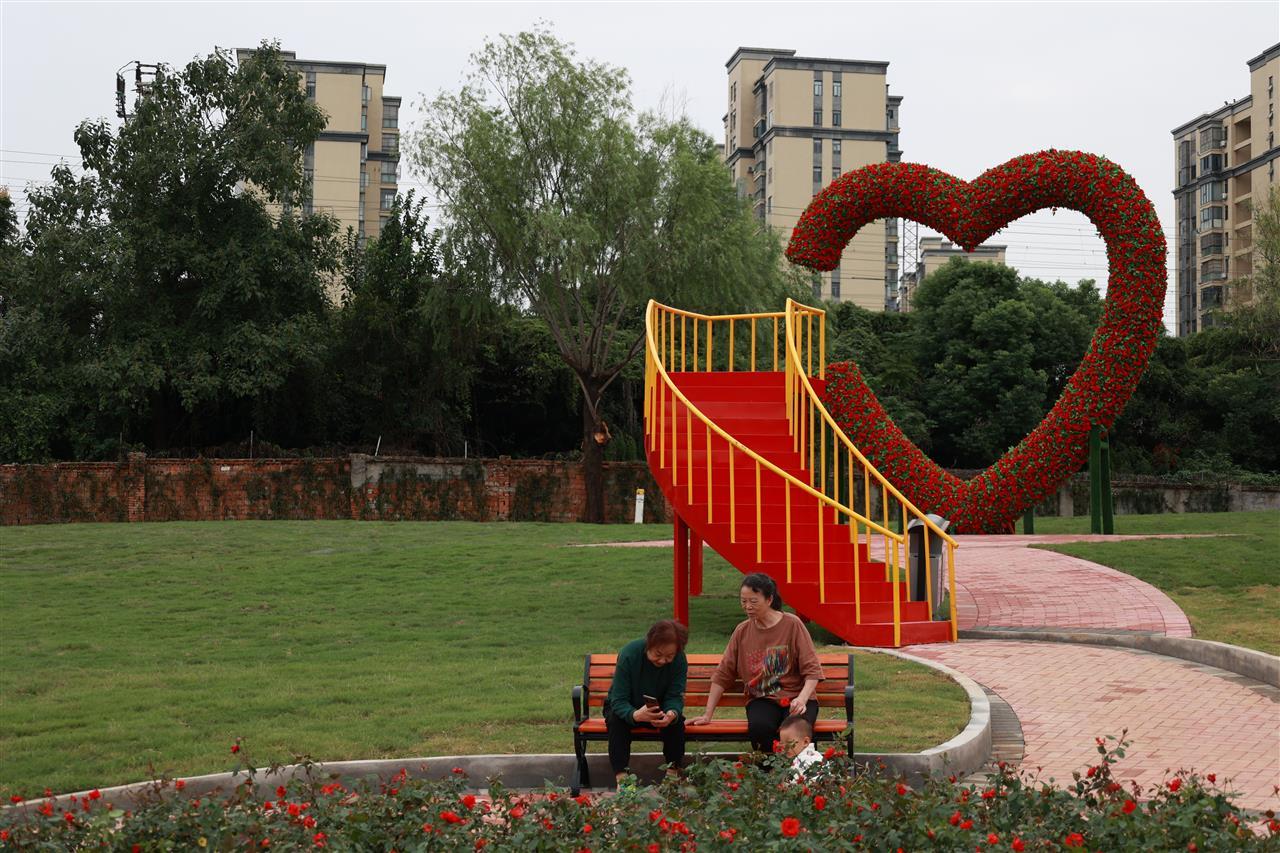 9月29日上午,在紧邻轨道的红色爱心打卡花篮与观景楼梯构成核心景观区,站在这里,既能目送动车缓缓驶过,又能轻松定格与“银龙”同框的打卡瞬间。公园另一侧,双爱心造型的花园里,红色花朵娇艳夺目;由红继木、金鸡菊等精心种植的“洪山大学之城”六个大字,每个字占地100平方米,宛如立体书法铺展在地面,与设计成动车形状的环形步道形成巧妙呼应。远处高铁呼啸而过,与地面的生态景观交相辉映,让自然之美与人文底蕴在此交融。