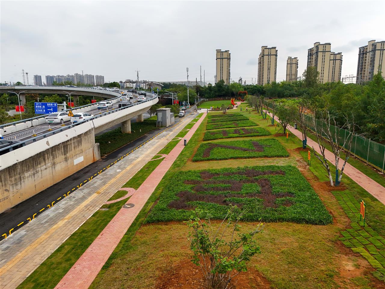 远处的高铁呼啸而过,宛若一条银龙穿梭于绿野之间,与地面上的生态画卷交相辉映。这片用草木写就的“地面书法”,不仅承载着大学之城的人文底蕴,更以生态诠释着城市与自然的共生之美。