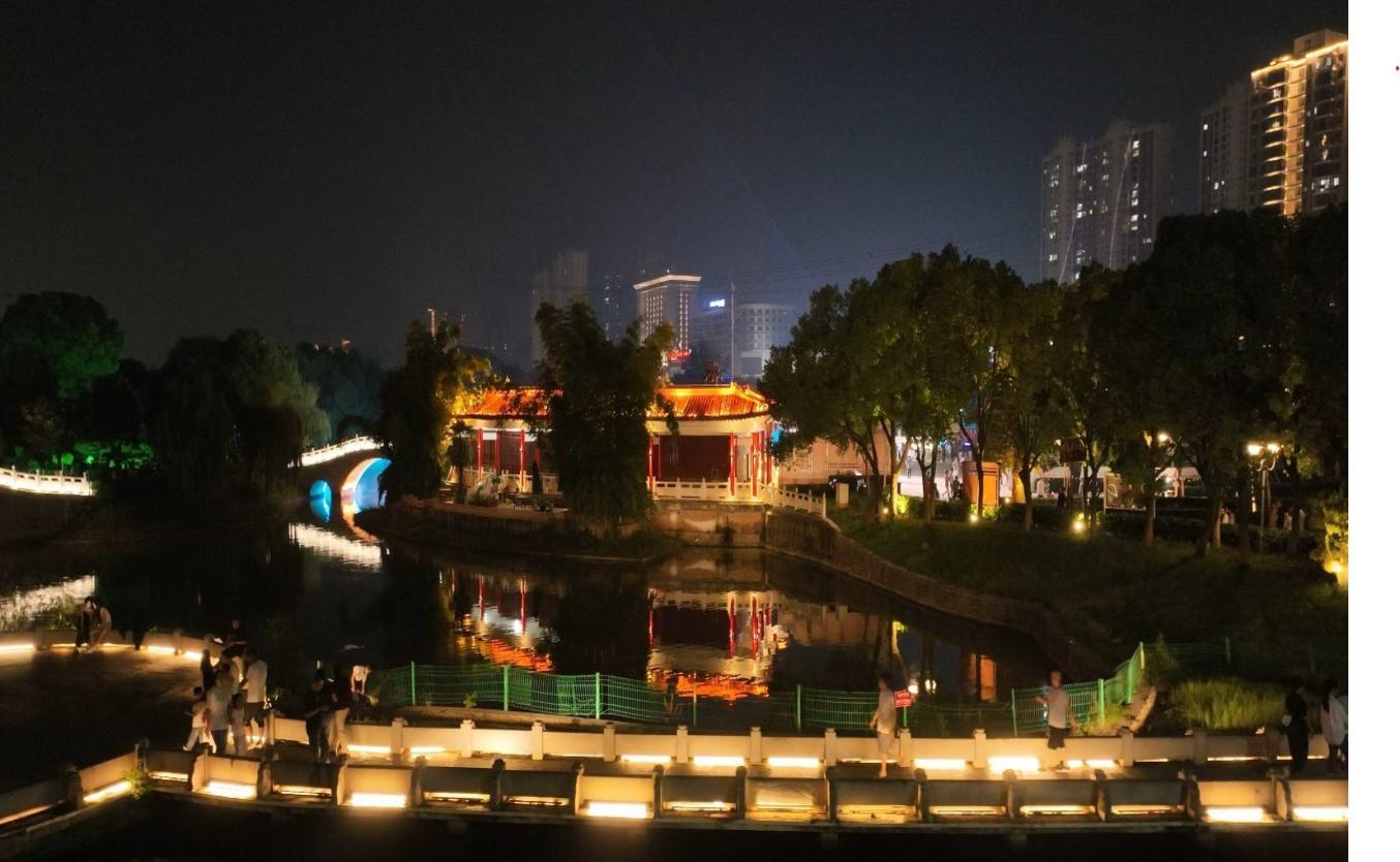 来到晚上,谭鑫培公园里水光交错,彩色灯带延绵不绝,变色霓虹交相辉映,人造气雾向上翻涌,将清澈湖水与变换灯光融为一体。这时,水上歌舞表演、水幕激光秀等视听盛宴准时登场。水袖演员们踏着游船,跟着婉转的京剧起舞,身影映在澄澈水道中,与岸边垂落的秋柳相映成趣,彰显水与舞的交融之美;晶莹水幕在夜色中展开,激光光束投射其上流转,如梦似幻,让文化韵味在光影中静静流淌。伴随着水上舞者的婀娜舞姿和音乐,岸边的观众也随之摇摆呐喊,将国庆首日的欢乐氛围推向高潮。