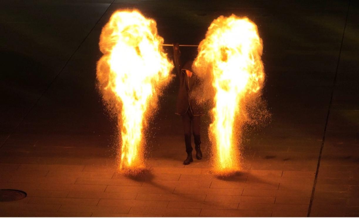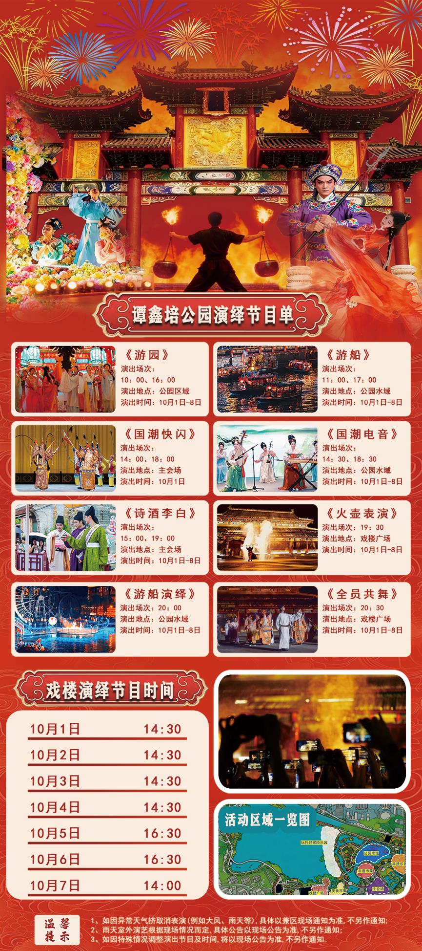 来到戏楼广场,即将登场的是火壶表演,随着观众眼光汇聚,火舞者闪亮登场。他手持火炬腾挪跳跃,橙红火焰划破夜色,时而划出炽热弧线,时而溅起点点火星,观众的惊叹声随火焰起落此起彼伏,手机闪光灯连成一片光海,让秋夜的公园满是灵动与热闹。随后,舞蹈演员齐登场,在欢乐节奏的带动下,邀请观众一起跳舞,用优美的舞蹈为祖国生日献礼。