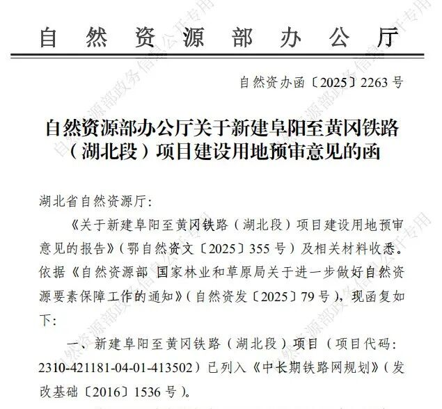 近日,自然资源部办公厅印发《关于新建阜阳至黄冈铁路(湖北段)项目建设用地预审意见的函》(自然资办函〔2025〕2263号),标志着该高铁项目建设用地预审获自然资源部批复,为项目全面开工建设奠定了基础。