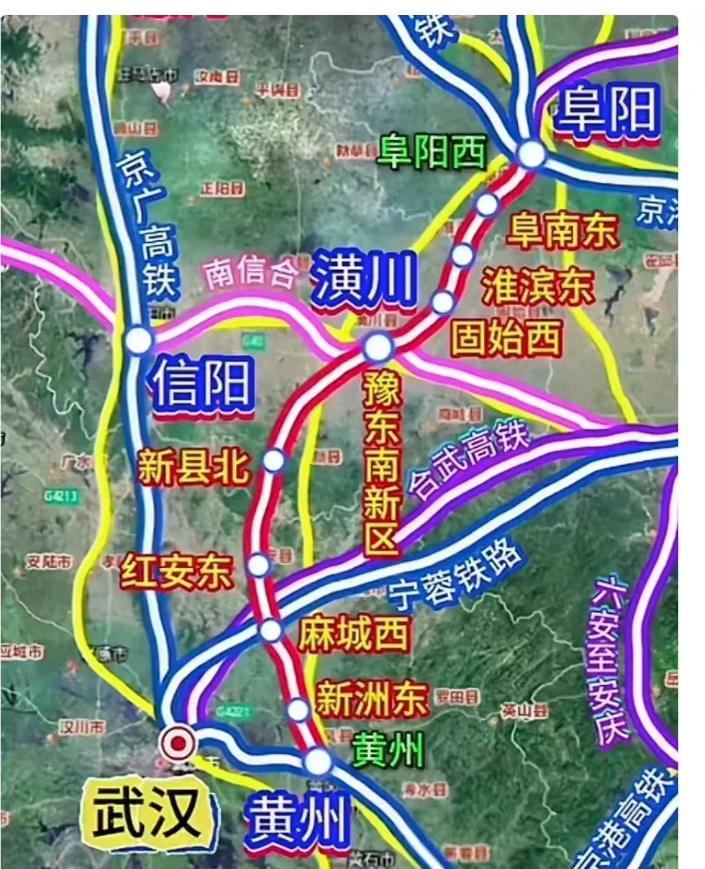 阜黄高铁是国家“八纵八横”高速铁路主通道之一京港(台)高速铁路通道的重要组成部分,起自安徽阜阳,终到湖北黄冈,横跨鄂豫皖三省。根据用地预审申请报告,该项目湖北省境内全长128.54公里,项目建设地点涉及湖北省武汉市新洲区;黄冈市黄州区、团风县、红安县、麻城市、黄梅县,共2个市6个县(市、区)。设置车站4座:新洲东站、红安东站、麻城西站、黄州站。阜黄高铁线路跨越安徽、河南、湖北三省,需穿越大别山地区,桥隧比例高,技术论证和施工难度较大。从国家层面来看,阜黄高铁建成后将促进京港(台)铁路贯通,完善国家铁路布局,对服务中部地区高质量发展、加快形成新发展格局意义重大。同时这一线路也能巩固大别山区集中连片特困地区脱贫攻坚成果,促进红色基因传承与红色旅游发展,助推大别山乡村振兴。阜黄高铁对武汉的国家铁路枢纽建设也具有战略意义。项目建成后,将有效完善武汉“超米字型”高铁网络。目前,武汉北上北京、青岛需经京广高铁郑州中转,其中武汉至北京方向受京广高铁满负荷运转影响运力受限,春运、国庆等节点常一票难求;前往青岛均需绕行郑州、连云港,两地1000余公里的距离高铁旅行时间约7小时。阜黄高铁开通后,武汉进京高铁线路将有新的选择,也为构建武汉至青岛高铁通道打下坚实的路网基础,武汉前往胶东半岛的铁路旅行时间将大幅压缩。根据《武汉市国土空间总体规划(2021—2035年)》,武汉将形成12个方向的“超米字型”高铁枢纽,包括两纵(京广、京九西通道)、两横(沪渝蓉、沪汉蓉)、两对角(福银、胶贵)等。阜黄高铁正是其中京九西通道的重要组成部分。