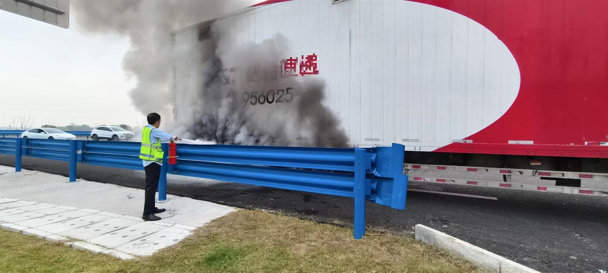 工作人员分为两组展开救援,一组负责报警并联系交管、消防部门,另一组使用现场灭火器对起火点进行初步扑救。由于火势蔓延较快,加上车上货物助燃,初期灭火未能完全控制火情。工作人员同步疏散周边车辆、设置警戒区,引导后方车辆绕行。