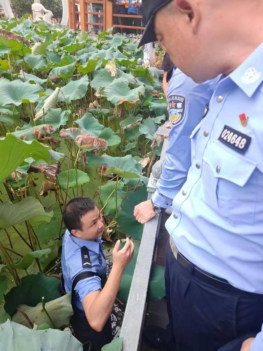 而这份坚守,总能在群众着急时递上“定心丸”。10月4日正午,古德寺荷花池边,两名广西女孩看着手机滑进荷塘淤泥,急得团团转,辅警赵晓明收到求助后,套上消防连体裤踩进没膝的泥里,摸了20多分钟,终于把沾满泥的手机举了起来,周围游客的掌声一下子就响了。