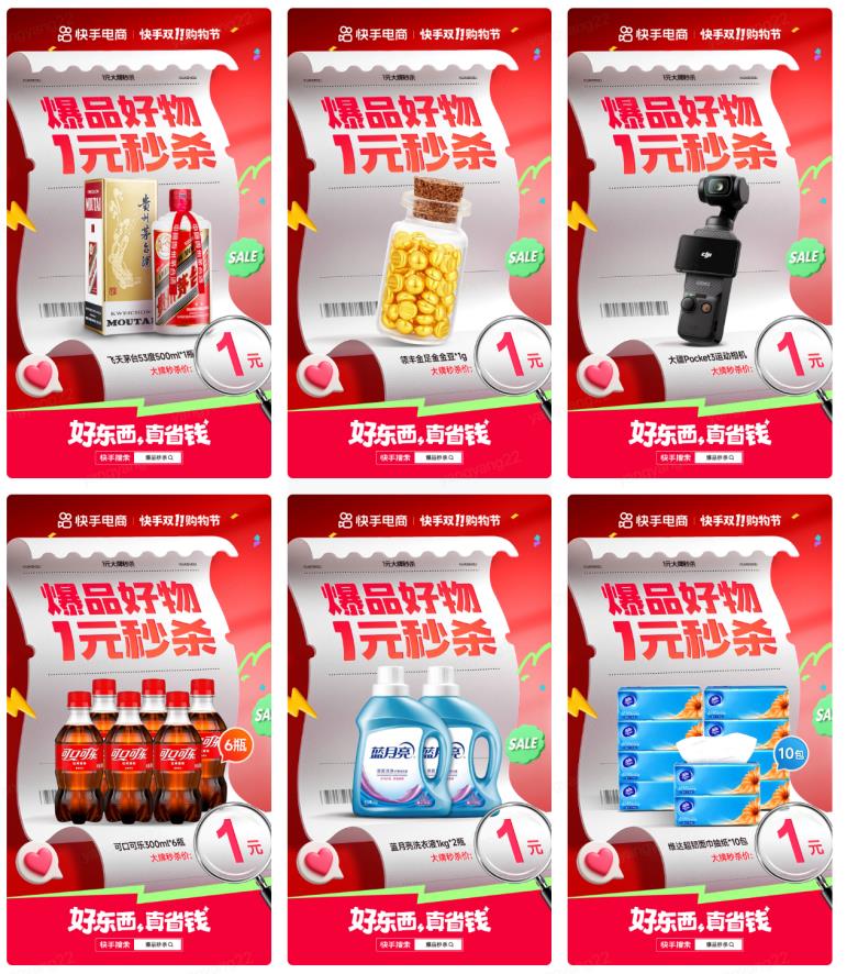 此外,上快手搜“爆品秒杀”,即可参与爆品好物1元秒杀,包含价值上千元的茅台、金豆、大疆运动相机,以及洗衣液、抽纸等不同品类的高需商品,还有养颜红枣、金龙鱼挂面、秋冬香氛护手霜等爆款好物11.11元抢购。
