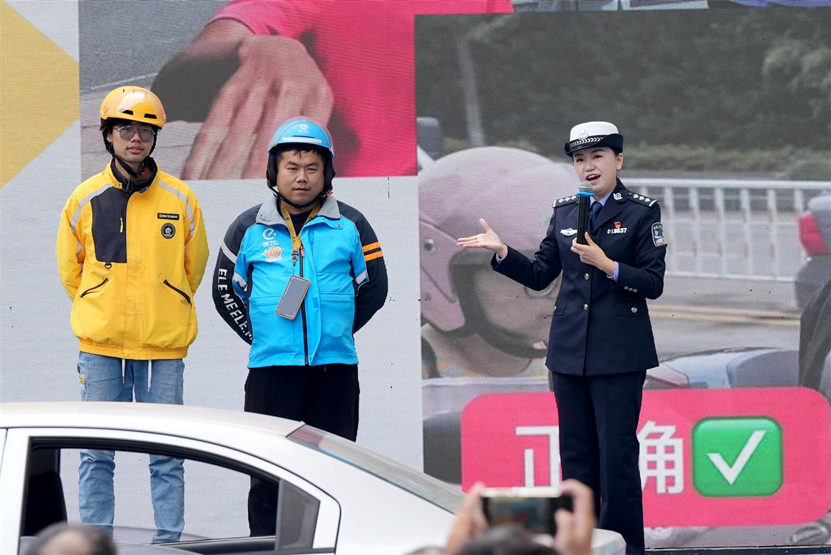 为了让安全知识更加直观,宣传活动特别安排了人员在现场进行电动车突发事故的情景模拟展演,电动车在急刹车时的侧滑、转弯过快的倾覆、遇到障碍物的失控等场景一一呈现,引得台下骑手们发出阵阵惊呼。美团骑手李先生直言:“太可怕了,危险就在瞬间!”彭丽斯通过情景再现形式引导大家主动学习交通安全知识,同时用数据加强记忆:“头盔不是道具,是事故发生时的保命工具——正确佩戴能降低80%的伤亡率。”接着,她现场讲解头盔的正确戴法,纠正“戴而不系”的常见误区。