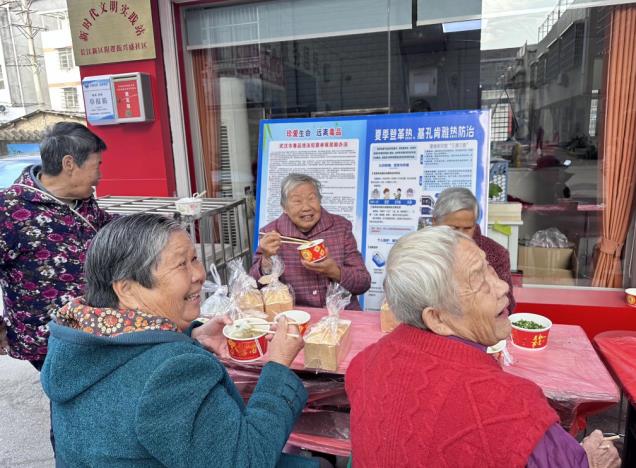 饺子陆续出锅后,社区门前整齐地摆放好了桌椅,300多位老人相继围坐在桌前,开启了饺子流水席。志愿者们端着热气腾腾的饺子,递到老人面前,亲切地说道:“张爹爹,慢慢吃,不够我再给您添!”“李婆婆,小心烫嘴!”老人们吃着饺子,脸上绽放出灿烂的笑容。“这饺子比我家里包的还香呢!”“社区考虑得真周到,这节日过得比过年还要热闹!”在腾腾热气中,笑声、交谈声与碗筷碰撞声相互交织,处处洋溢着温馨的氛围。