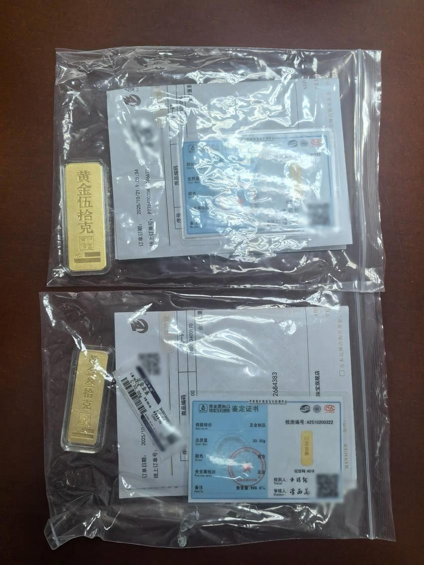 然而,就在充值成功后,“客服”却告诉胡先生因为他操作失误,款项被冻结了无法提现。就在胡先生不知所措之际,“客服”马上抛出新的“解决方案”:需要购买黄金并邮寄过来,之后以债券形式返现。急于“退费”和“提现”的胡先生再次轻信,在对方指引下购买了两根金条——价值30,750元的30克金条和价值51,000元的50克金条,并邮寄到广东省广州市从化区某写字楼。此时的胡先生虽有疑虑,但已骑虎难下,只能按要求下单邮寄。