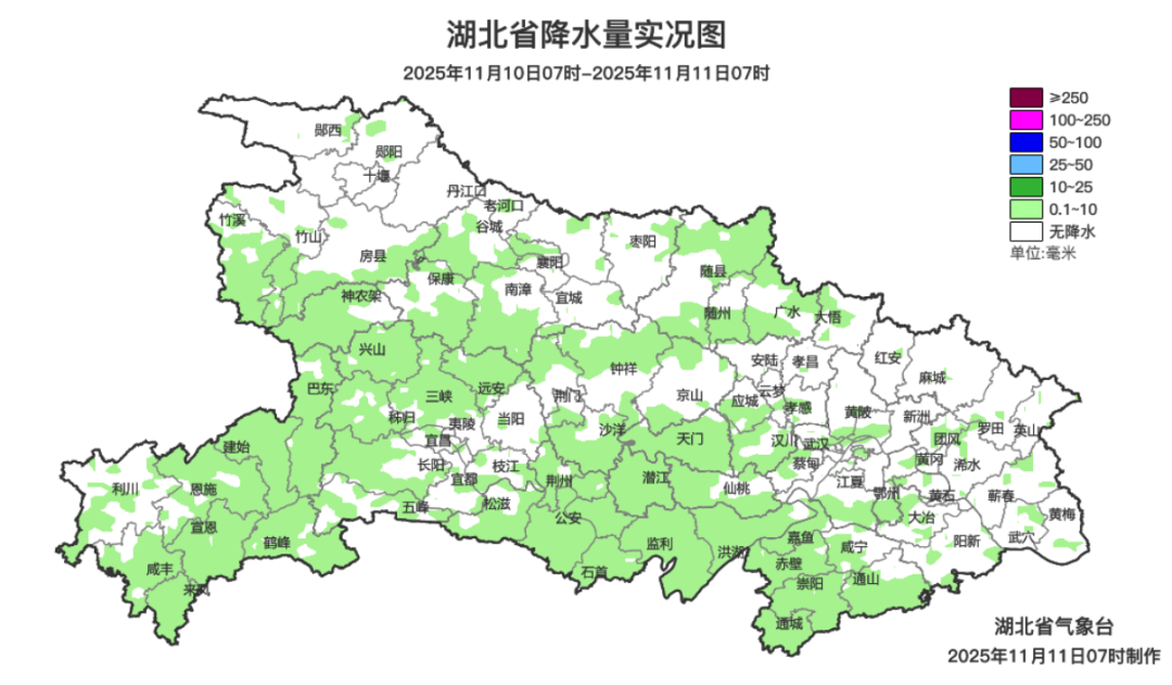 11月11日08时-12日08时,鄂西南阴天到多云;其他地区多云间晴天。最高气温18~22℃,最低气温鄂西北6~9℃、其他地区9~13℃,偏北风3级、阵风4到6级。