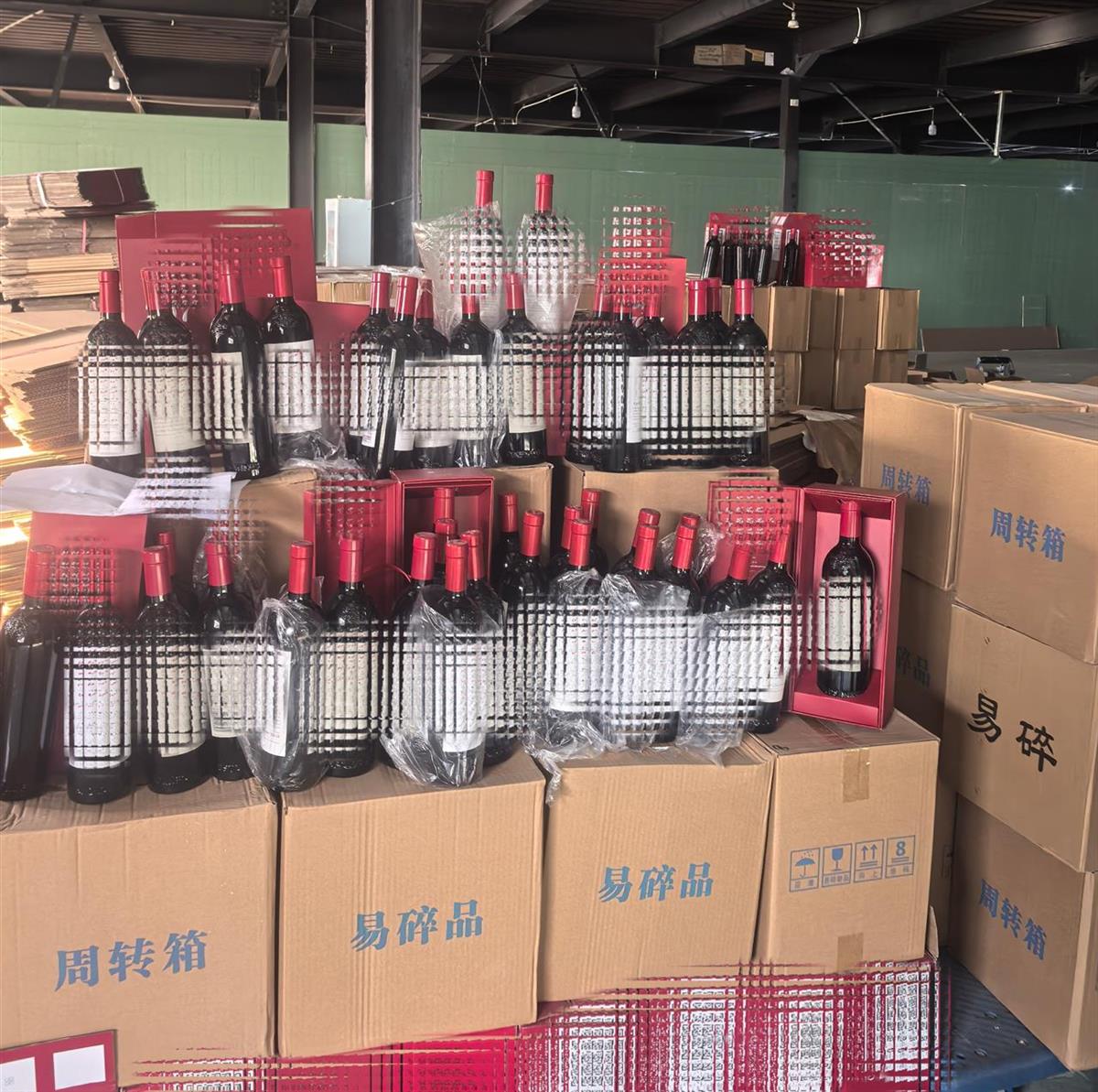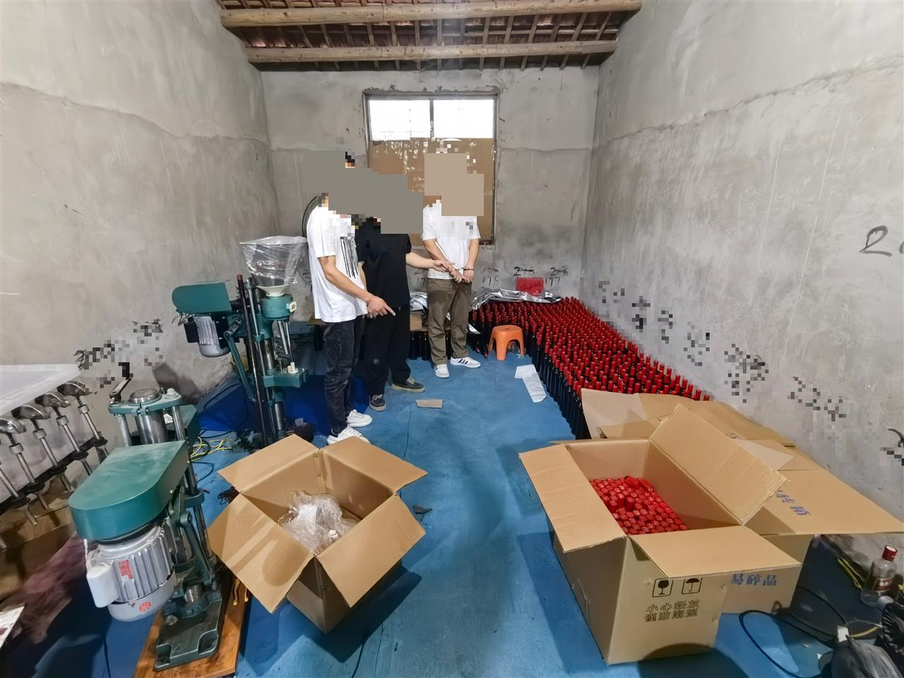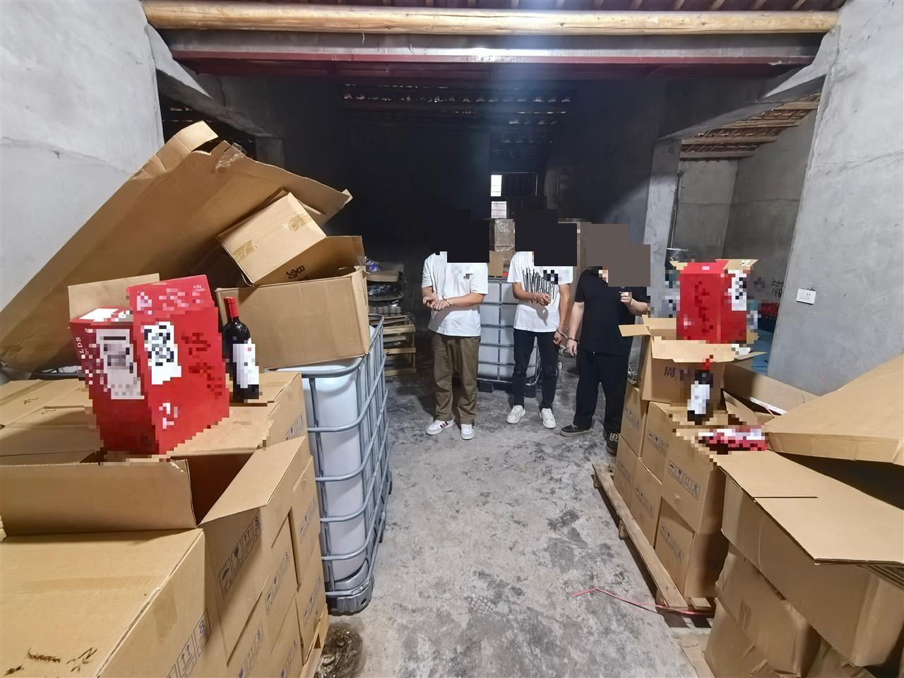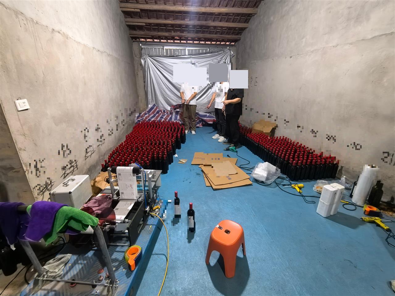 民警当场将三人控制,并对现场进行了彻底搜查。眼前的景象令人震惊:民房门口停放的面包车上已装载了50箱共计300瓶假酒;打开民房大门,里面“别有洞天”:四五间被隔断的房间里,堆满了已经封装完毕的假冒某品牌红酒成品、等待贴标的半成品、堆积如山的空酒瓶和包装盒。