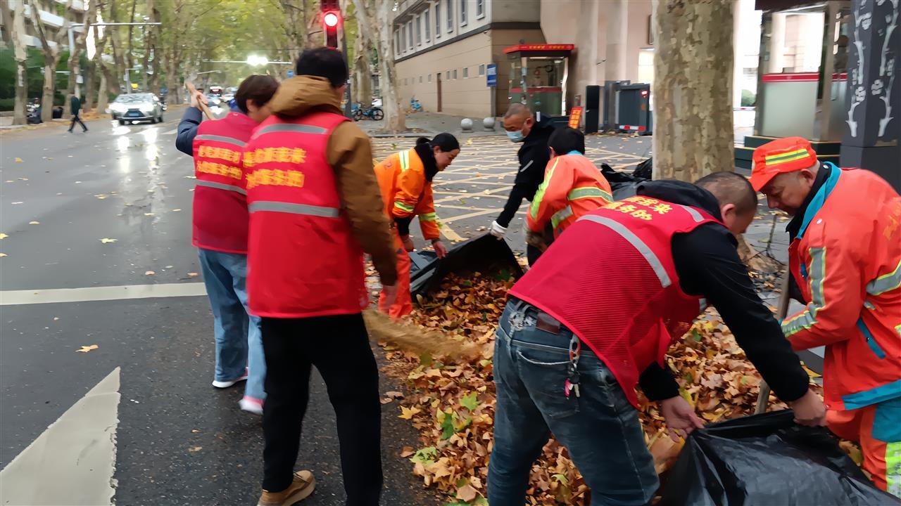在各街道社区,机关干部与身着红马甲的社区志愿者并肩作战,成为应急保障的重要力量。大家聚焦地铁站点、医院、交叉路口等重点区域,分工协作、默契配合:有的协助规整散乱停放的共享单车,有的弯腰捡拾路面落叶杂物并参与打包,有的及时上报倒伏树木、断枝等情况,有的动手复位移位的水马、倒伏的挡板,全力保障城区道路通行顺畅。