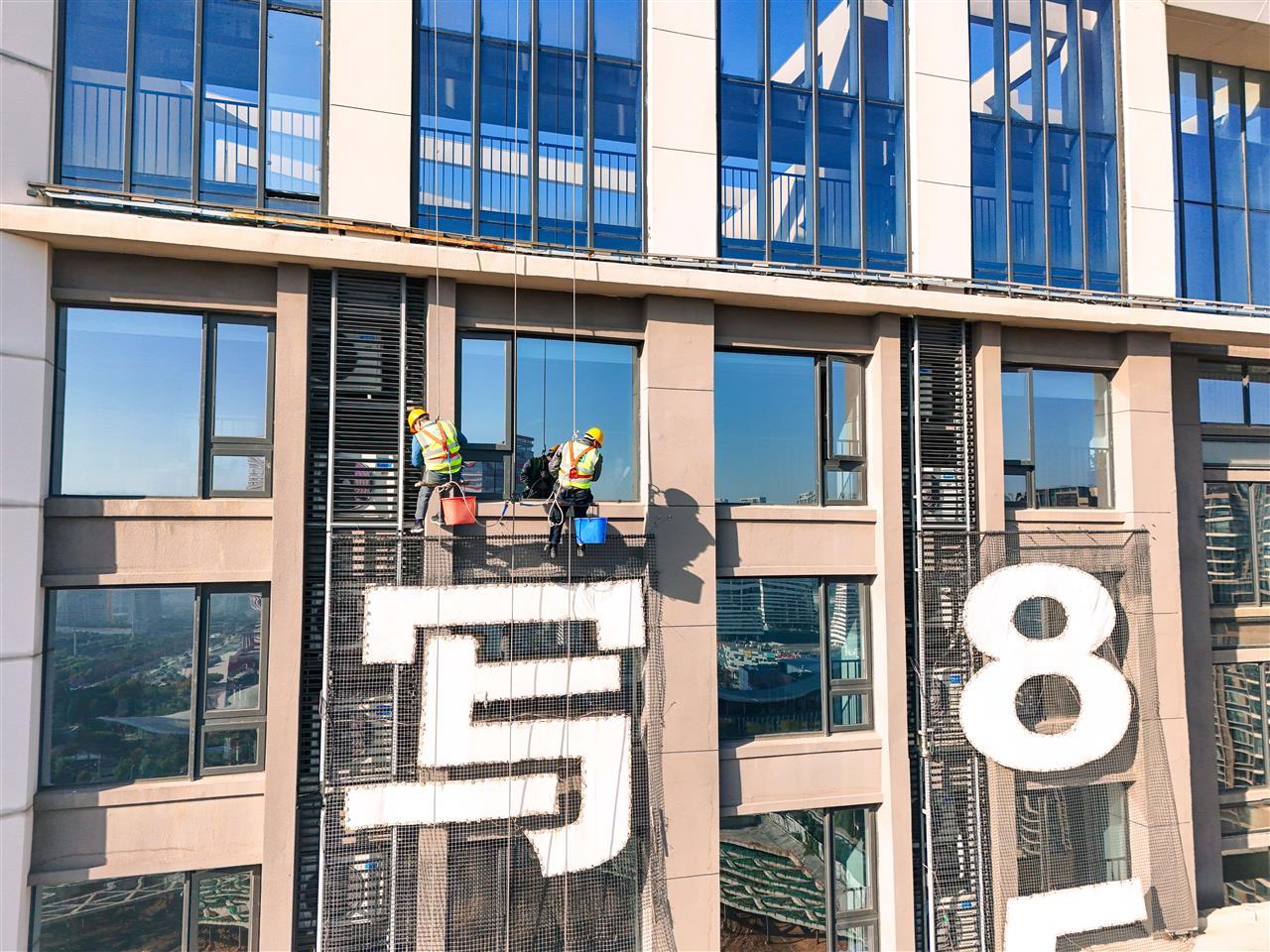 11月26日上午10点,两名“蜘蛛人”从写字楼楼顶缓缓降下(见下图),在25至29层的外墙间作业,安全拆除了违规广告。