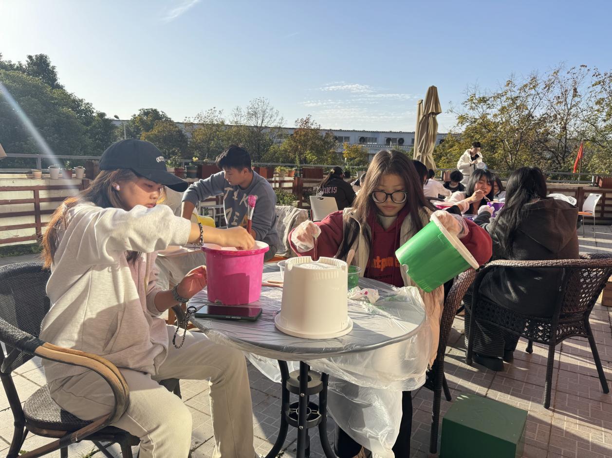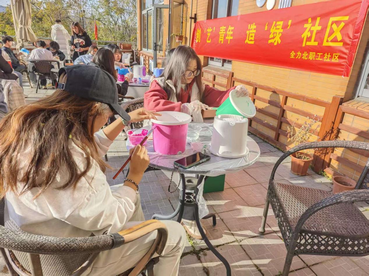 活动现场气氛热烈,欢声笑语不断。平日里忙于学习和工作的青年此刻化身为“社区艺术家”,全神贯注地勾勒线条、调配色彩。有的将喜爱的卡通形象绘于盆上,充满童趣;有的则以抽象图案或自然风景为主题,尽显艺术才华;还有的结伴而坐,互相交流创作灵感,在协作中拉近了彼此的距离。原本朴素的白色树脂花盆,在大家的巧手描绘下,变成了一个个独一无二的艺术品。创作环节结束后,参与者们将作品安置在社区露台一角的专属展架上,形成了一个生机勃勃、色彩斑斓的“社区艺术绿植角”,后期,社区会将准备好的绿植移栽到绘制的花盆中。