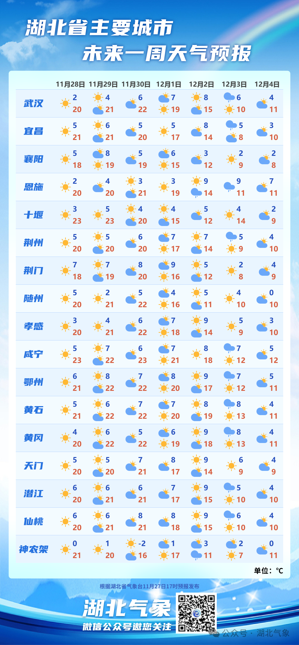11月27日,武汉市气象台发布预报,到12月1日,武汉以晴到多云为主。