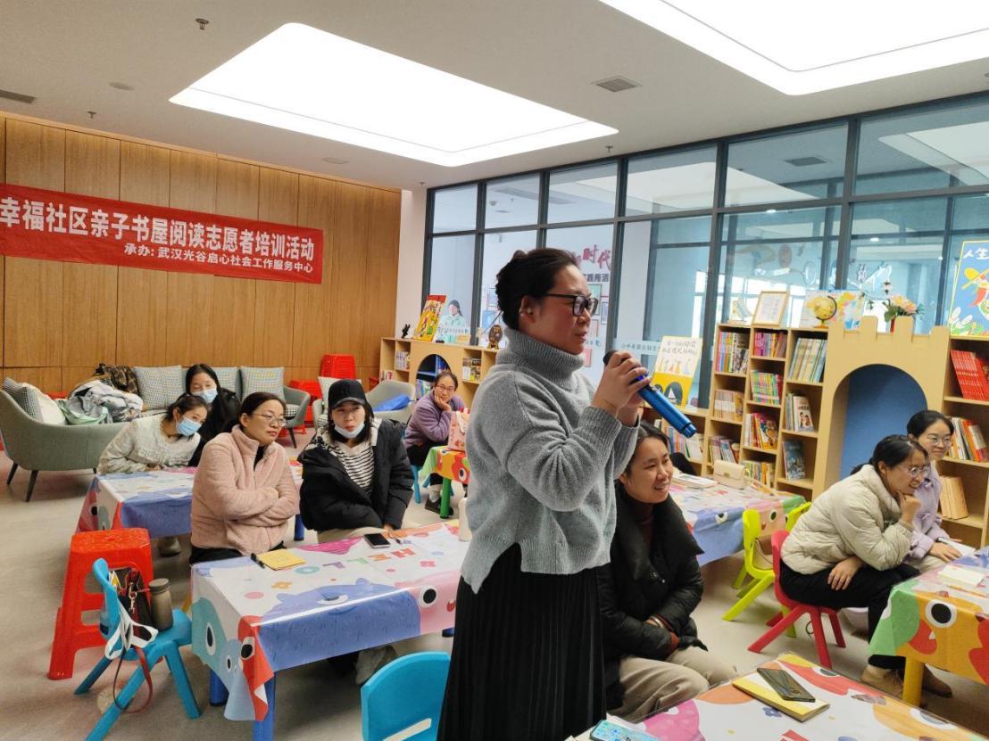 11月28日上午,武汉长江新区幸福社区活动室里暖意融融,二十余位社区居民齐聚一堂,参加亲子书屋阅读志愿者专项培训,在资深阅读推广人田园老师的引领下,学习用绘本搭建与儿童沟通的心灵桥梁。本次培训以“掌握童心的钥匙”为主题,是幸福社区推进亲子书屋建设、深化社区文化服务的重要举措,旨在培养一批既通晓儿童心理又擅长阅读引导的专业志愿者队伍,让书香真正浸润家庭。