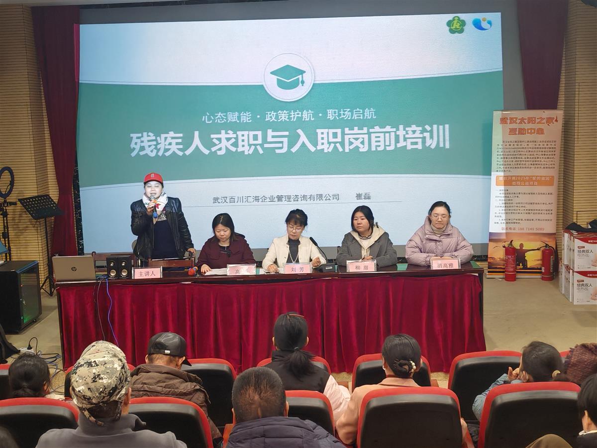 开班仪式上,武汉太阳之家互助中心项目负责人周立峰作动员讲话,武汉长江新区社会事业局主任高颖、湖北省残疾人福利基金会副理事长刘芳分别致辞。与会嘉宾与谌家矶街道社工站工作人员一同向学员赠送了温暖礼包。随后,武汉百川汇海企业管理咨询有限公司人事专家崔磊围绕职场沟通、简历制作、面试技巧等内容开展了首场实务培训。