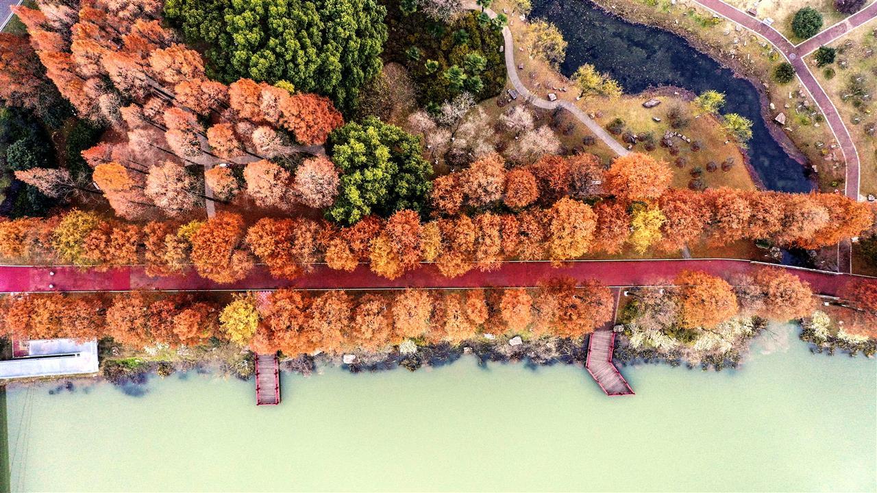 “停车坐爱枫林晚,霜叶红于二月花。”12月9日,走进京广高铁旁边的武汉市青山公园,百余株红枫次第浸染,枫叶与碧波粼粼的丽湖、挺拔参天的水杉相互映衬,仿若一幅浓墨重彩的油画(见下图)。