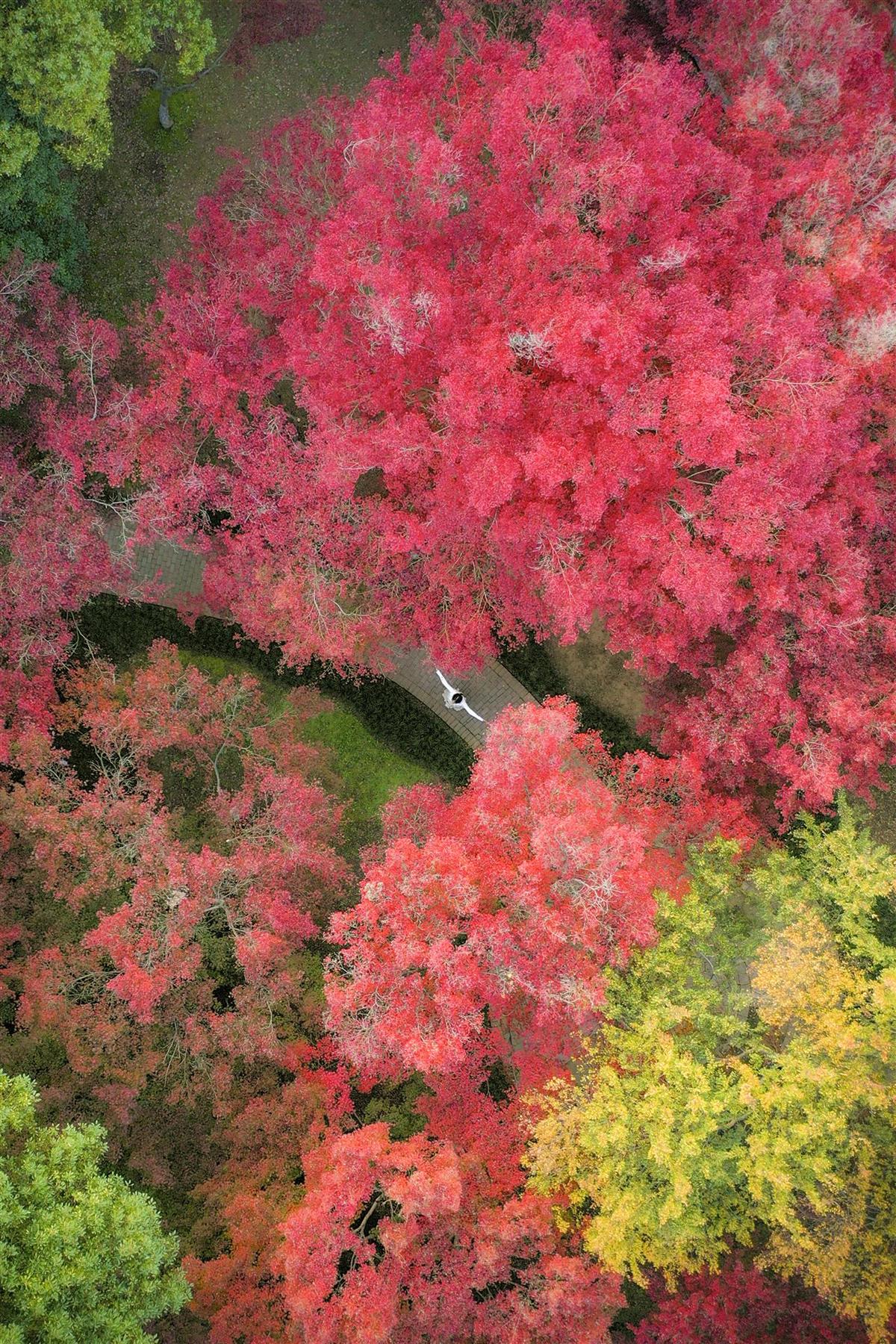 青山公园工作人员介绍,园内现有红枫类树木110余株,其中,最负盛名的当数丽湖畔的“霜天红叶”。这里矗立着树龄超过40年的鸡爪槭十余株,它们的叶片已尽数转为炽烈深红,倒映在湖面,如梦似幻,是市民朋友们必到的“打卡点”。
