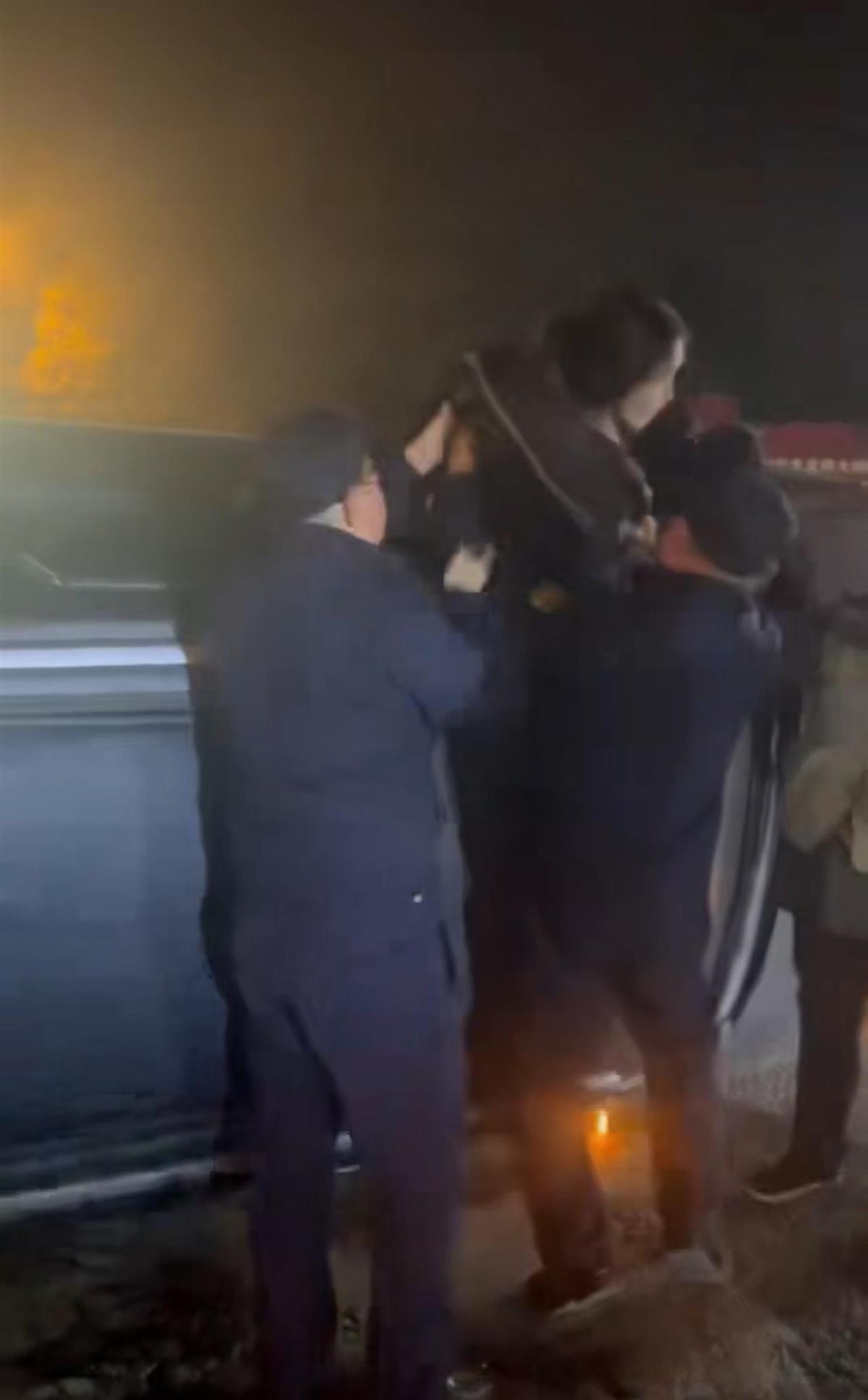 两名被困人员被托举到车外