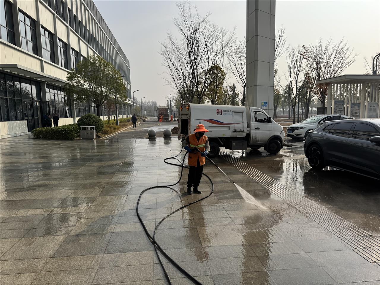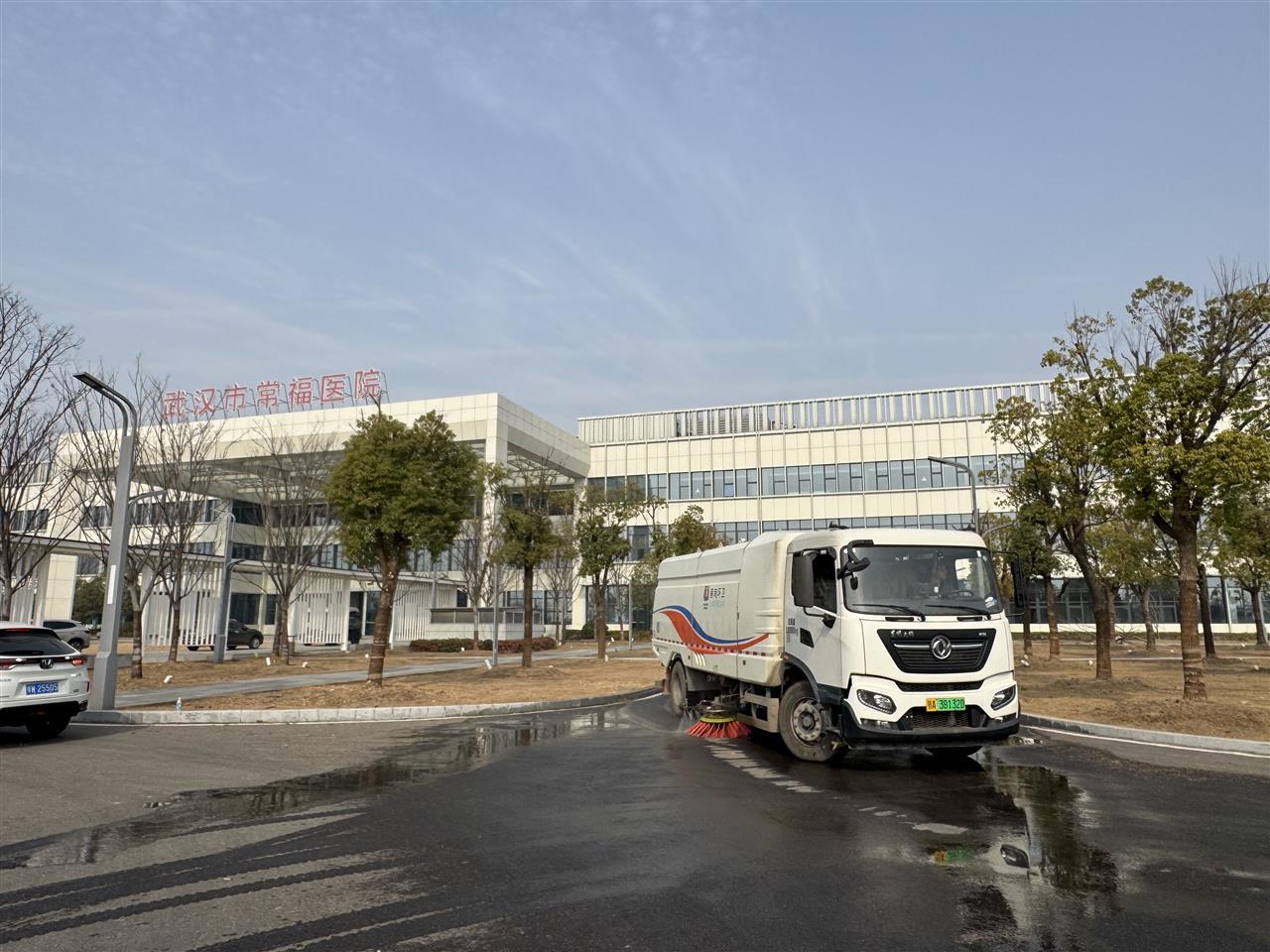 当天,蔡甸区环卫中心出动60余名环卫工人、20台机械化作业车辆,对医院周边道路实施全天候巡回保洁,重点清理施工残留垃圾与绿化带杂物,加密路面冲洗频次确保无积尘污渍;同时安排专人每日对医院内部及停车场开展细致消杀,严守防疫要求。