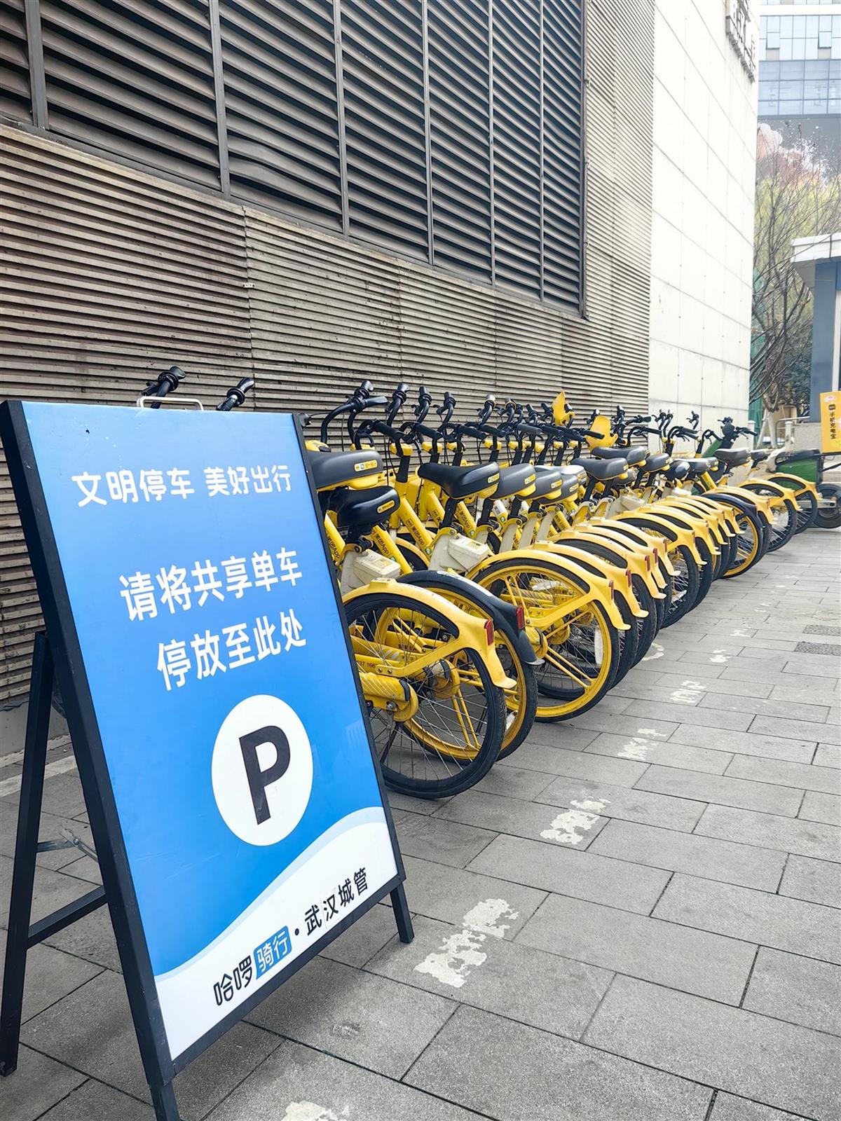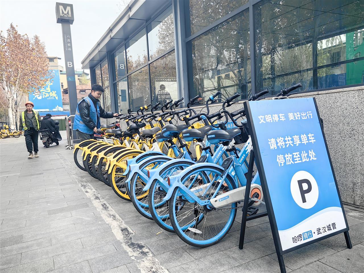 为方便市民停放共享单车,城管部门在中山大道六渡桥地铁口、京汉大道前进四路、京汉大道前进一路、沿江大道民生路口、沿江大道民权路口设置共享单车临时停放区(见下图),请广大市民游客在工作人员引导下有序停车。